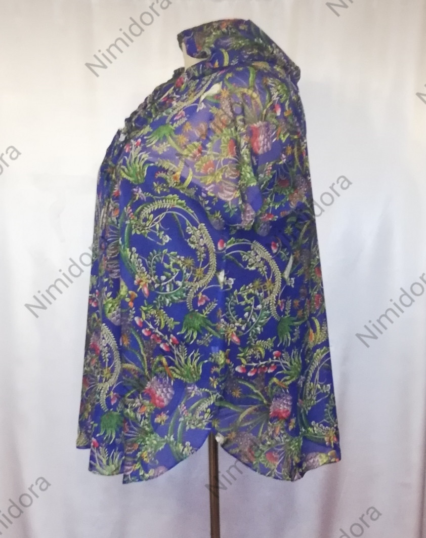 Легкая воздушная туника из шифона с красивым рисунком. Туника прямого силуэта с удлиненной линией плеча. Глубокий полукруглый вырез декорирован широкой круговой деталью, которая сзади образует капюшон с кулиской по краю. Спинка простая без центрального шва. Линия низа мягко закругляется к боковым швам. Туника практически не просвечивается.