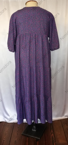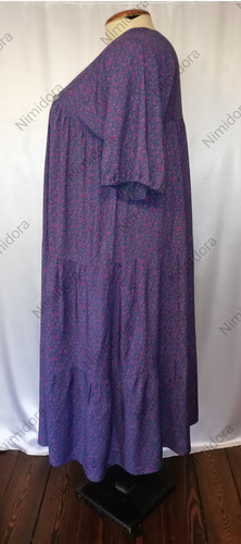 Нарядное платье из тонкого, мягкого, неэластичного полотна. Платье расклешенного силуэта. Прямоугольный вырез. Перед и спинка на квадратной кокетке, продублированной основной тканью. От кокетки вниз ткань собрана в мелкие складочки.Низ платья состоит из трех ярусов. Рукав широкий, слегка укороченный, цельнокроенный с верхней частью платья, собран на регулируемую резинку. Передняя кокетка отделана декоративным кружевом.