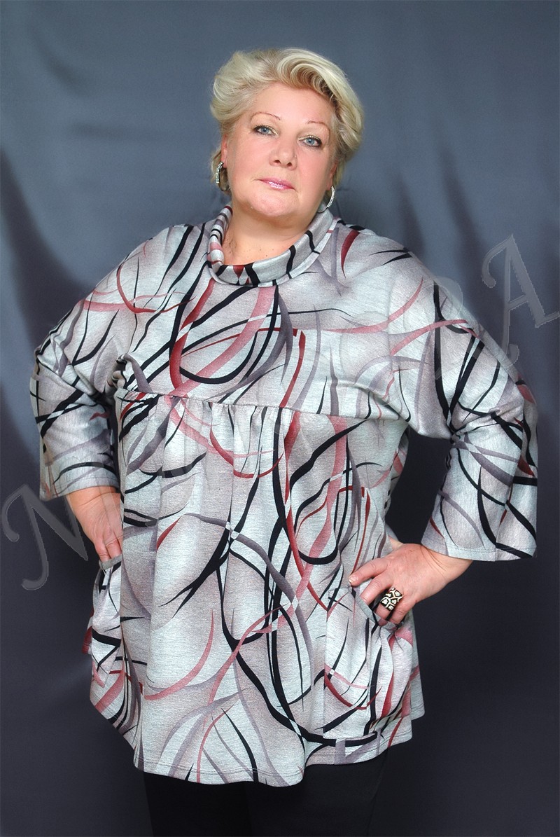 Красивый джемпер из плотной, эластичной ткани. Джемпер прямого силуэта. Воротник - мягкая стойка. Перед отрезной под грудью, от линии отреза вниз ткань присборена. Внизу пришиты два накладных кармана. Вход в карман закруглен, от входа заложены три складки. Спинка простая, без швов. Рукава укороченные, цельнокройные со спинкой и верхней деталью переда. Джемпер без подплечников, без разрезов в боковых швах.