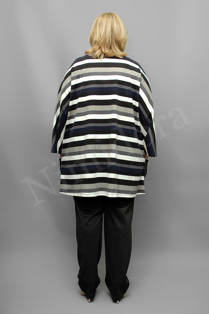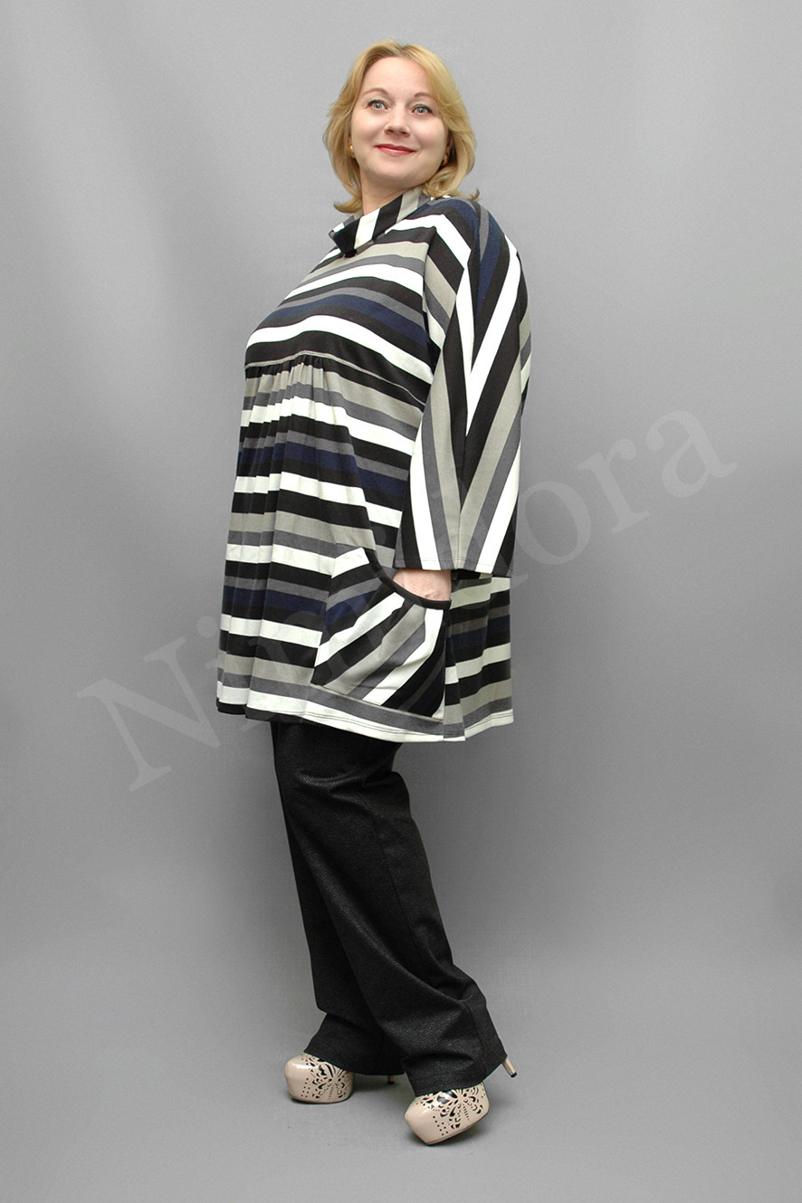 Красивый джемпер из плотной, эластичной ткани в полосочку. Джемпер прямого силуэта. Воротник - мягкая стойка. Перед отрезной под грудью, от линии отреза вниз ткань присборена. Внизу пришиты два накладных кармана. Вход в карман закруглен, подчеркнут тесьмой черного цвета, от входа заложены три складки. Спинка простая, без швов. Рукава укороченные, цельнокройные со спинкой и верхней деталью переда. Джемпер без подплечников, без разрезов в боковых швах.