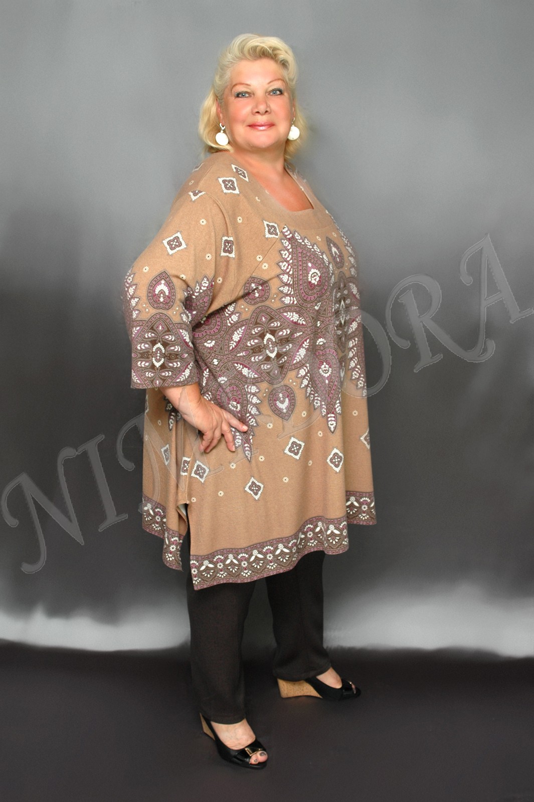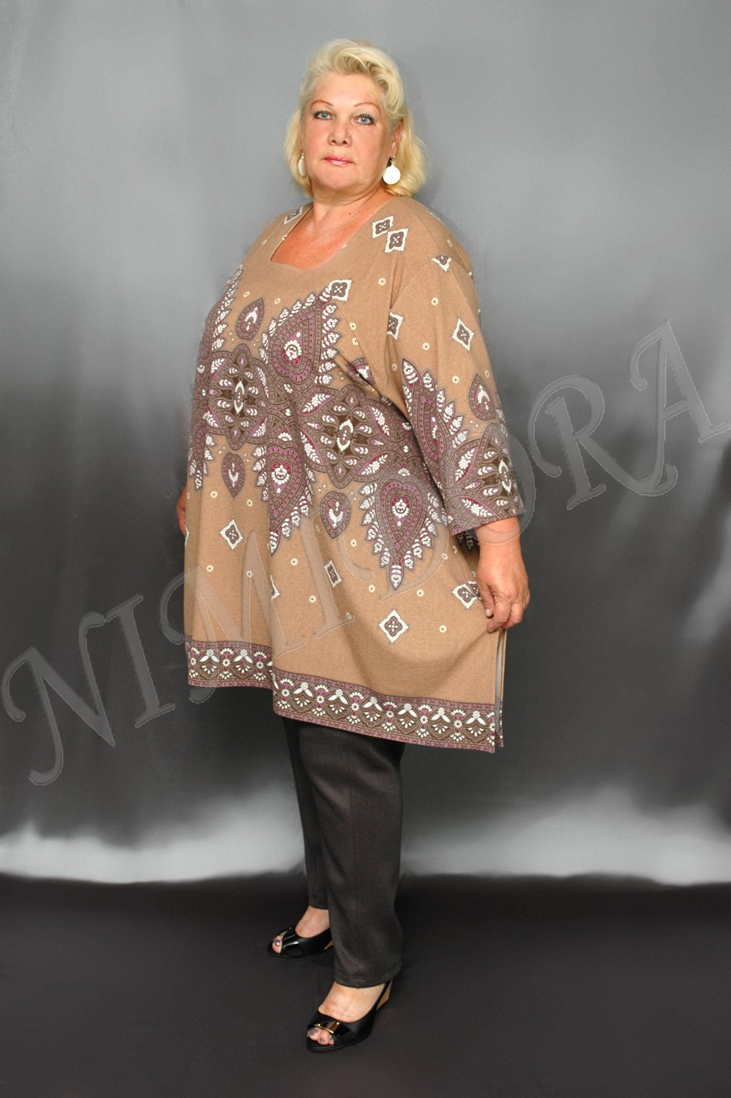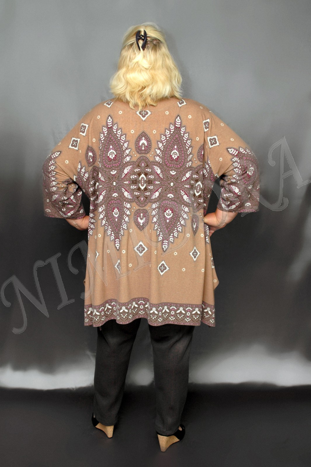 Красивая женственная туника из мягкого, слегка пушистого и тепленького на ощупь трикотажного полотна с рисунком-купоном. Туника расклешенного силуэта. Полукруглый вырез оформлен широкой планкой, продублированной основной тканью. Перед на небольших кокетках от плечевых швов до нижнего края выреза. На спинке имеется небольшая кокетка, выполненная из однотонной части полотна. Туника сильно расклешена от линии бедер, что создает неравномерную линию низа. Рукава втачные, с одним швом. Туника без подплечников. Длина по центру спинки 82-83 см. Цвет: кофе с молоком.