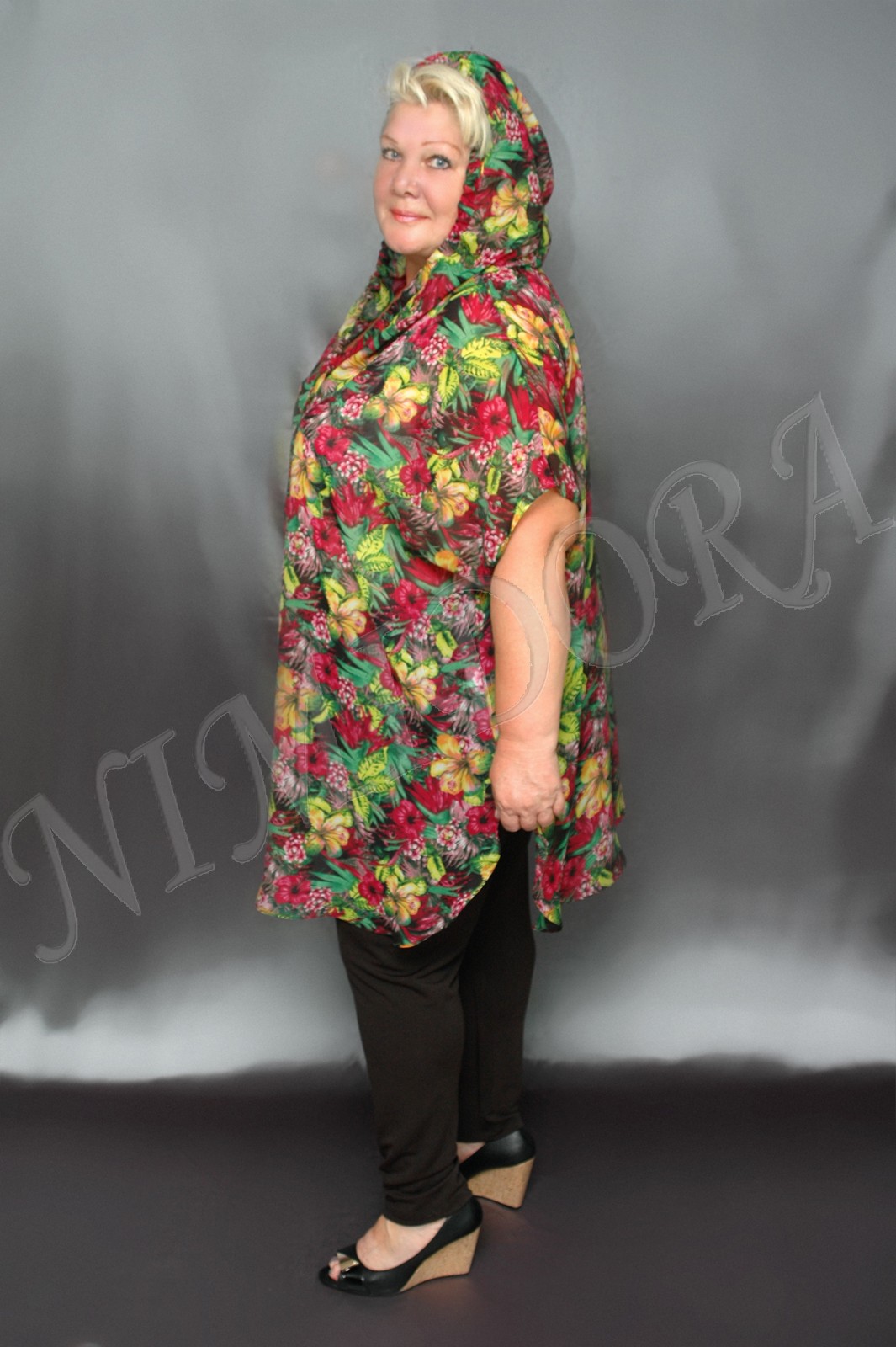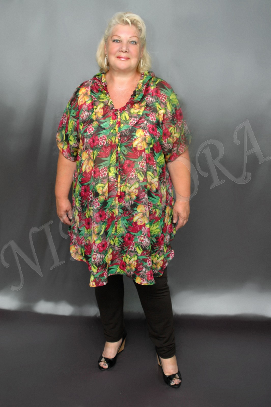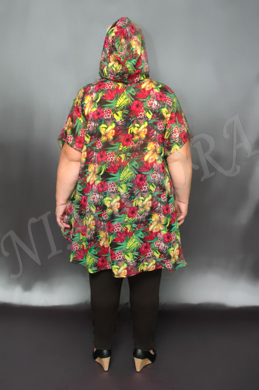 Легкая воздушная туника из шифона с красивым рисунком. Туника прямого силуэта с удлиненной линией плеча. Глубокий полукруглый вырез декорирован широкой круговой деталью, которая сзади образует капюшон с кулиской по краю. Спинка простая без центрального шва. Линия низа мягко закругляется к боковым швам. Туника практически не просвечивается.