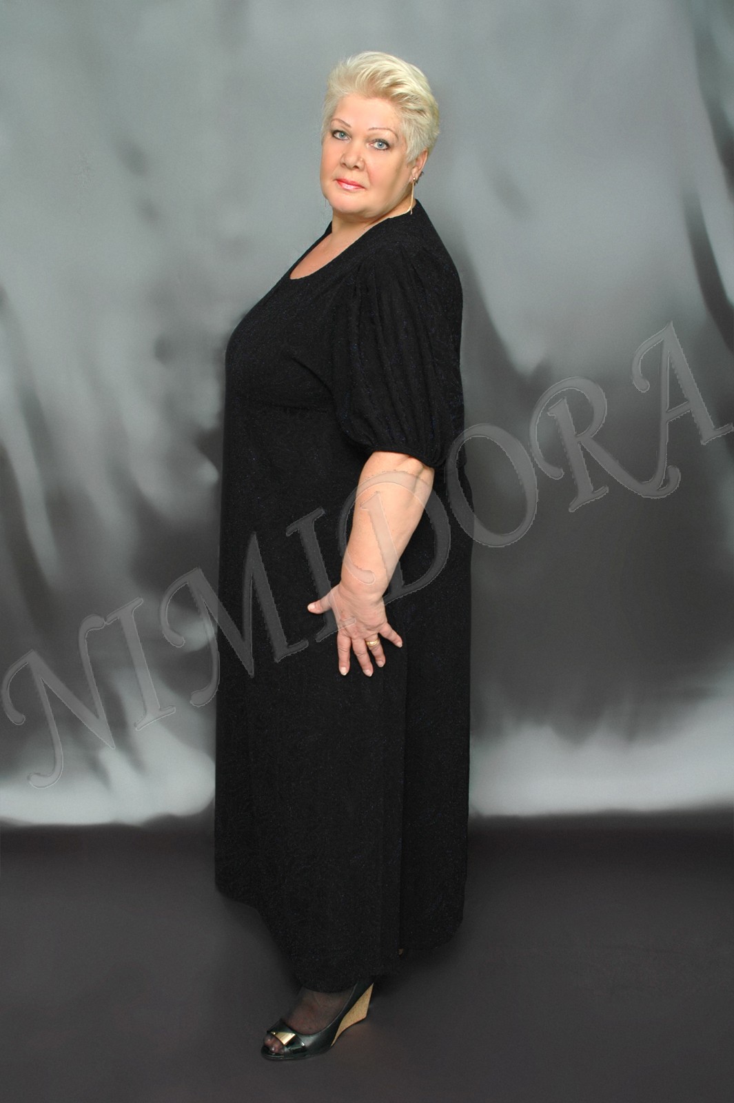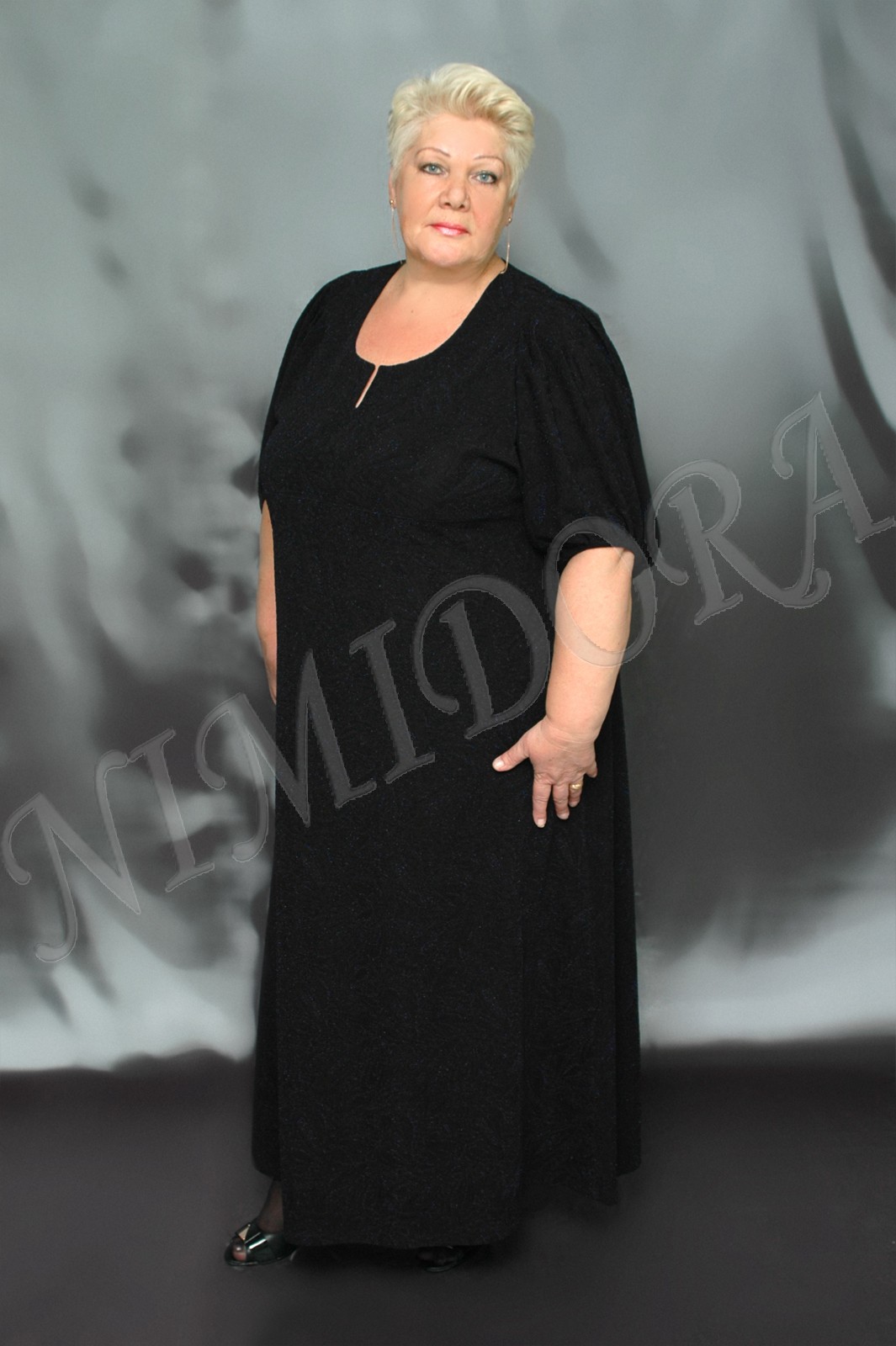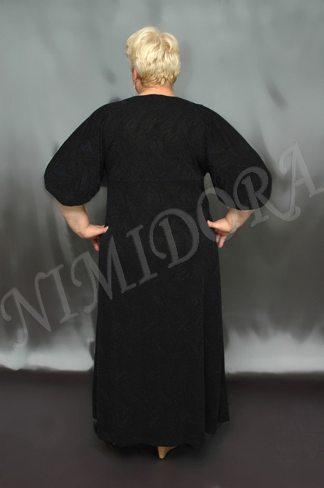 Нарядное длинное платье из мягкого, очень эластичного фактурного полотна с люрексом. Платье слегка расклешенного силуэта. Фигурный вырез отделан подкройной обтачкой. Перед и спинка на прямой кокетке. рукав широкий, цельнокройный с кокеткой. На плече сделан шов, от него заложены складочки. Низ рукава собран на узенькую манжету. Низ платья подвернут и подшит двойным эластичным швом.