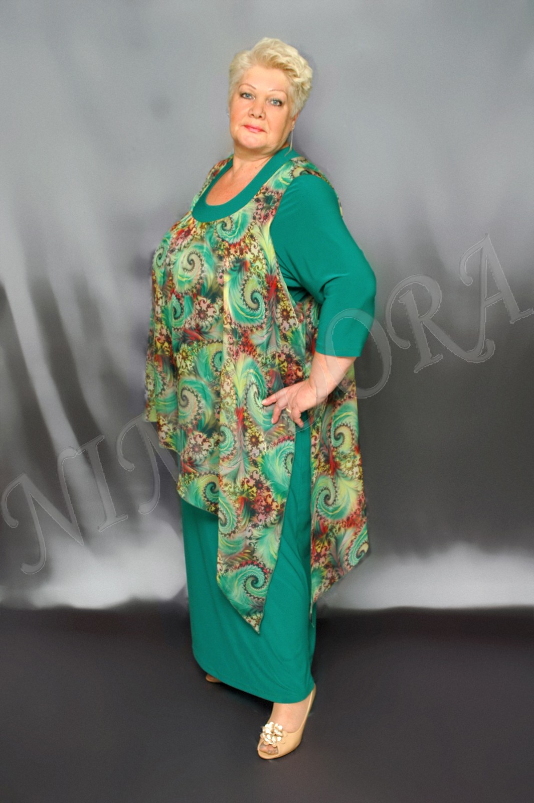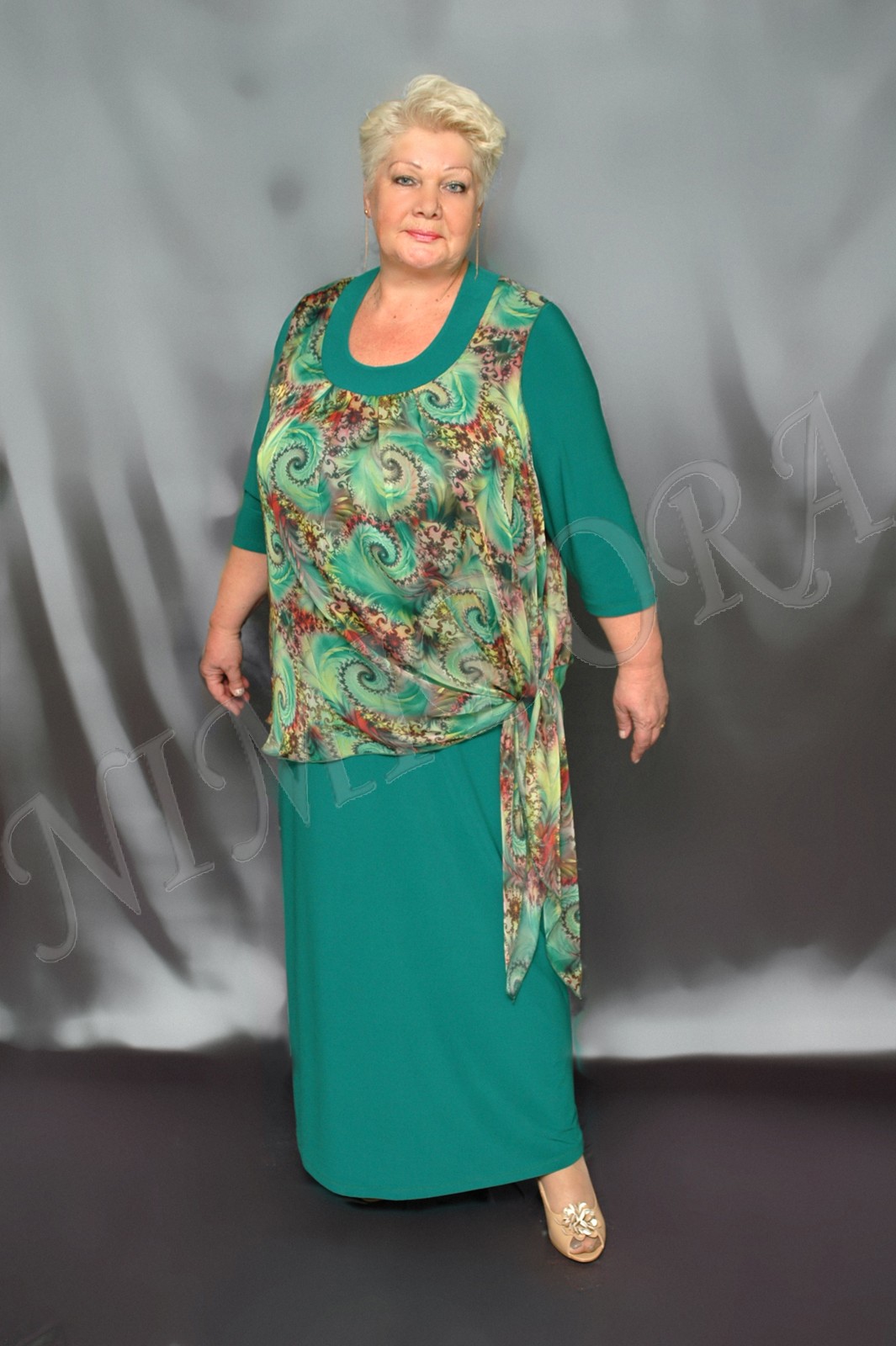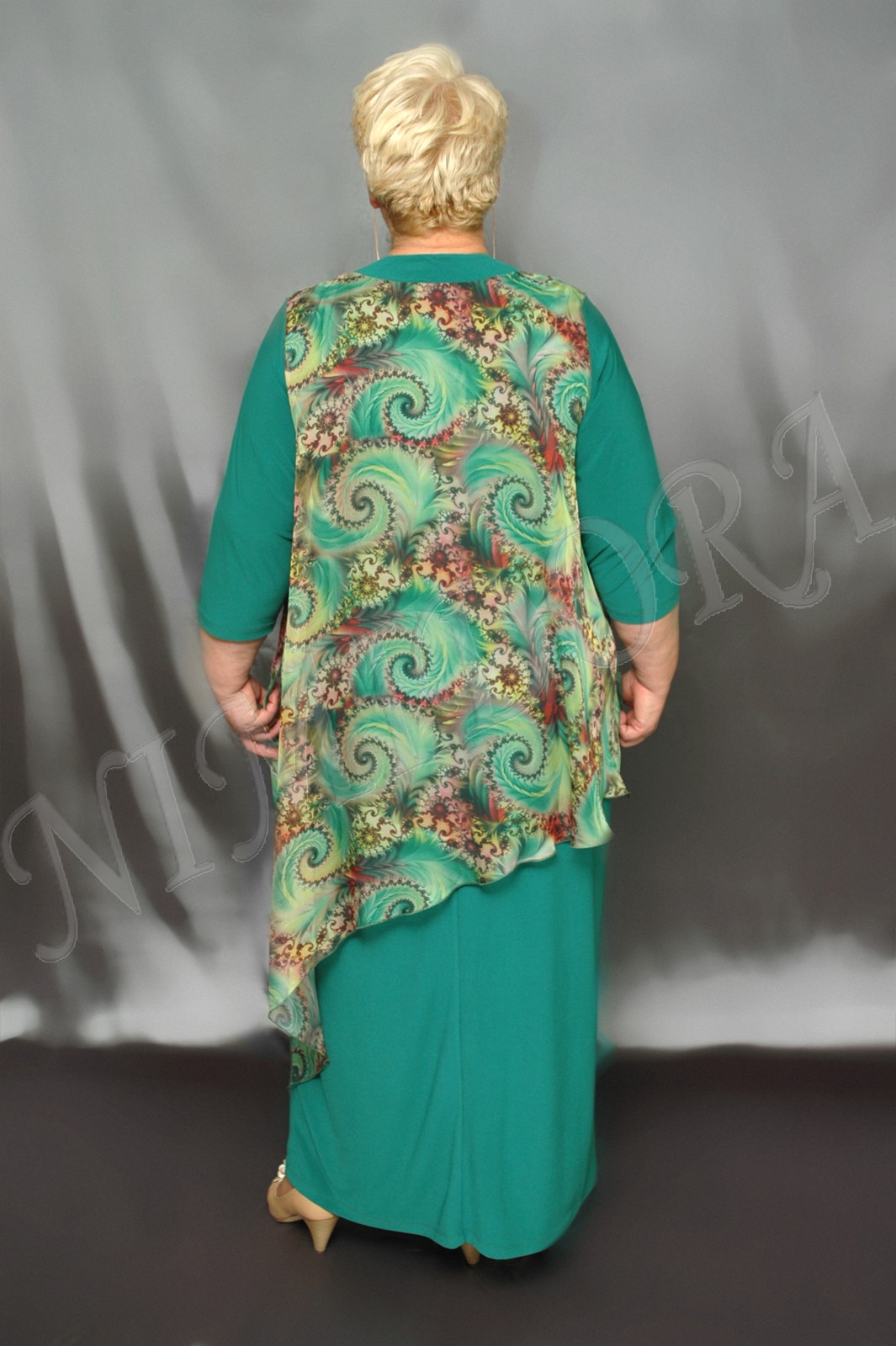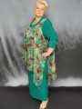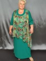 Нарядное платье из тонкого, очень эластичного однотонного трикотажного полотна. Ткань гладкая, "скользящая". Отделка - из шифона с рисунком. Платье прямого силуэта. Вырез полукруглый. Перед и спинка на небольшой полукруглой кокетке. Перед без вытачек и рельефов, спинка с центральным швом. Рукав втачной, короткий, с одним швом, заужен к низу. В шов кокетки вшита декоративная деталь из тонкого, полупрозрачного, неэластичного полотна (шифона) с рисунком (состав ткани: 100 % полиэстер). Шифоновая деталь свободно драпируется поверх основных, трикотажных деталей платья. Шифоновая деталь значительно короче по длине, слегка присборена наверху, под кокеткой. В боковых швах - высокие разрезы. Край ткани по низу, по разрезам боковых швов и по проймам отделан плотным оверлоком до образования легкой волнистости. Линия низа - асимметричная. Платье без подплечников, без разрезов в боковых швах.