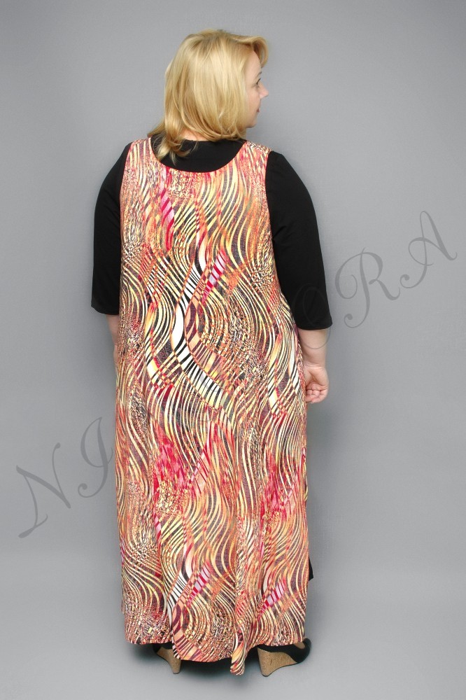 В боковых швах высокие разрезы. Низ платья, вырез и проймы подвернуты и подшиты. Вдоль боковых швов пришиты кулиски с завязками. По центру переда тоже пришита кулиска с завязками. При желании можно менять форму накидки.