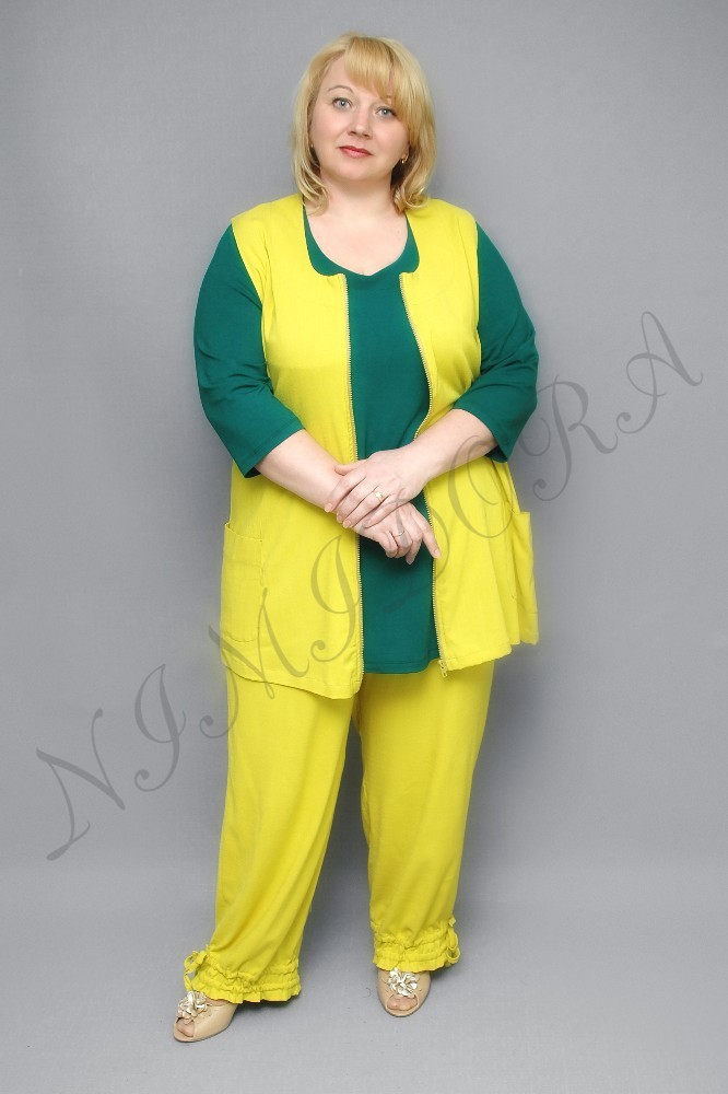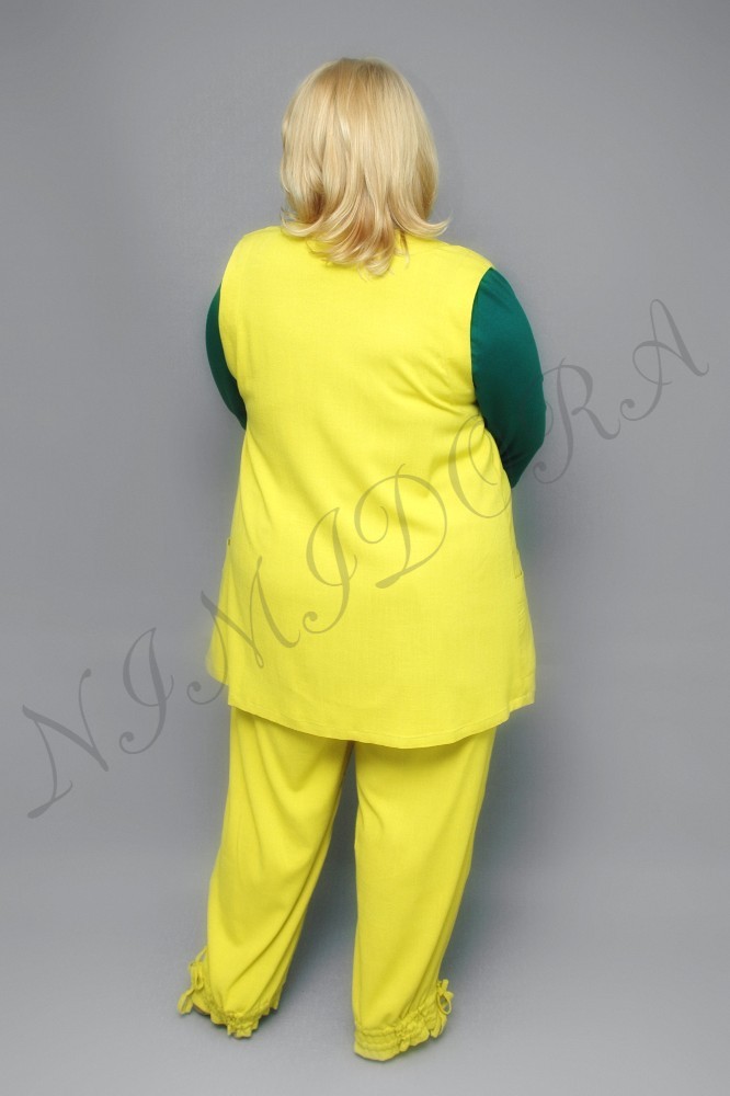 Жилет выполнен из очень эластичного однотонного полотна с едва заметными фактурными полосочками. Жилет прямого силуэта. Полукруглый вырез. Застежка на пластиковую молнию. Полочки без рельефов, спинка простая. Вырез, проймы и вход в карманы отделаны обтачкой. Жилет без разрезов в боковых швах.