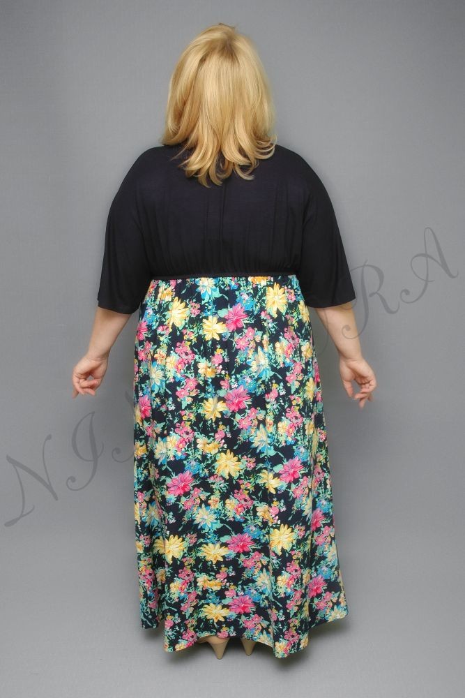 Красивое длинное платье из двух видов ткани. Верхняя деталь и рукава - из тонкого и мягкого однотонного трикотажа. Нижняя деталь - из тонкой, мягкой, приятной на ощупь неэластичной ткани с ярким цветочным рисунком.