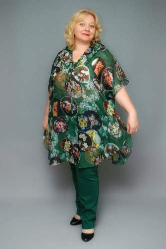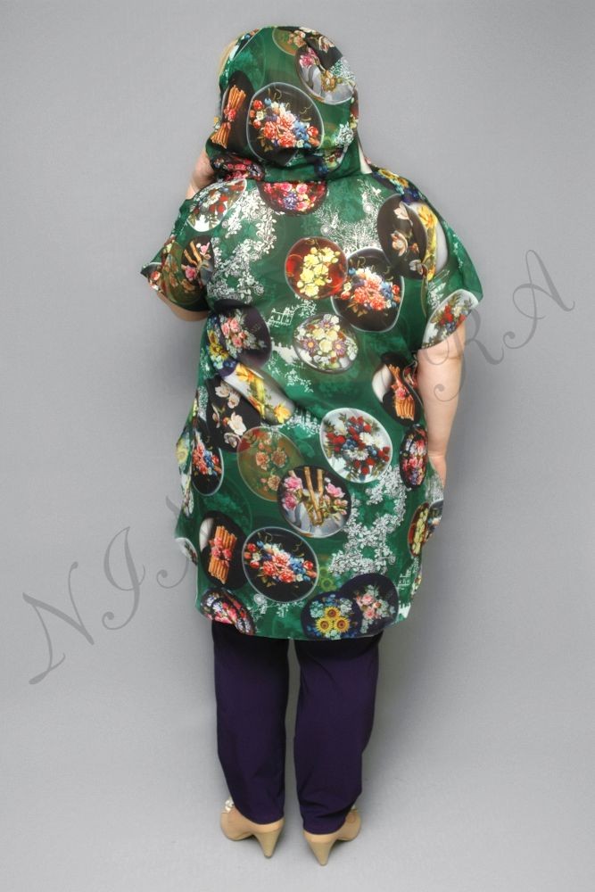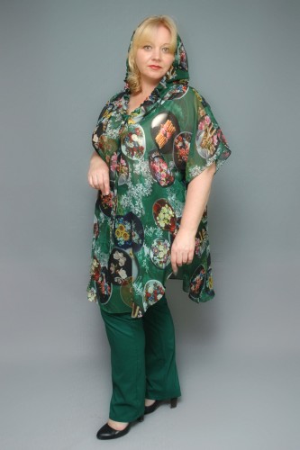 Легкая воздушная туника из шифона с красивым рисунком. Туника прямого силуэта с удлиненной линией плеча. Глубокий полукруглый вырез декорирован широкой круговой деталью, которая сзади образует капюшон с кулиской по краю. Спинка простая без центрального шва. Линия низа мягко закругляется к боковым швам. Туника практически не просвечивается.