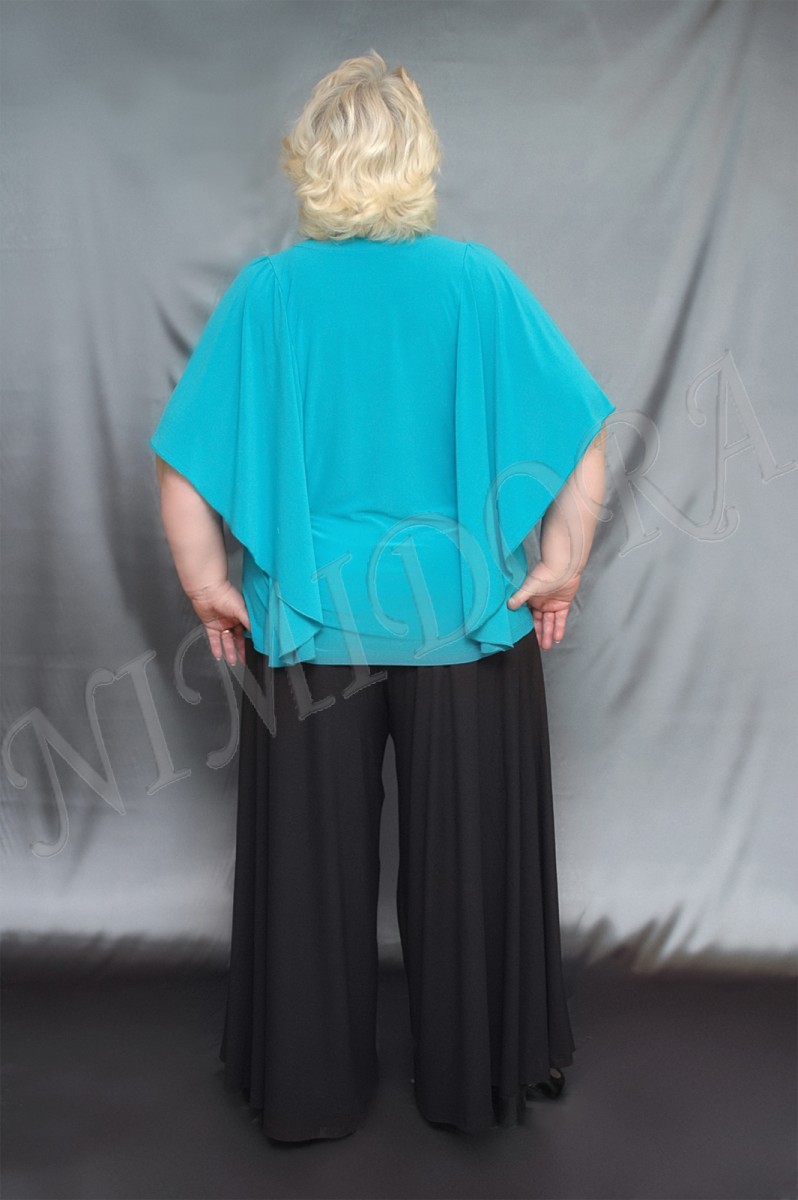 Основа - топик с полукруглым вырезом и с рельефными швами от плеча спереди и на спинке. В рельефные швы вшиты очень широкие, слегка присобранные на плечах "крылышки" (ширина 37-38 см). Нижний край их обработан плотным оверлоком.