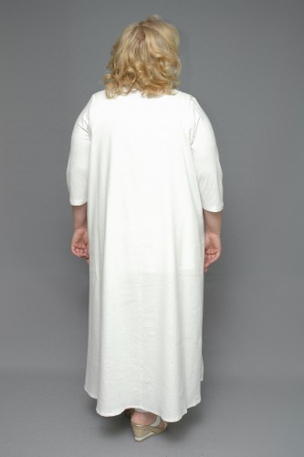 В боковых швах высокие разрезы. Низ платья, вырез и проймы подвернуты и подшиты. Перед цельнокроеный, спинка с центральным швом. Спереди пришиты большие карманы.