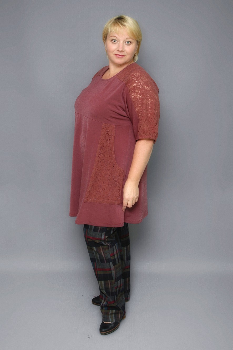 Туника из плотного, мягкого, эластичного трикотажного полотна .Туника прямого силуэта. Полукруглый вырез отделан узкой бейкой из основной ткани.Оригинальные накладные карманчики на отрезной части переда. Рукав цельнокройный, укороченный. Туника без разрезов в боковых швах, без подплечников.