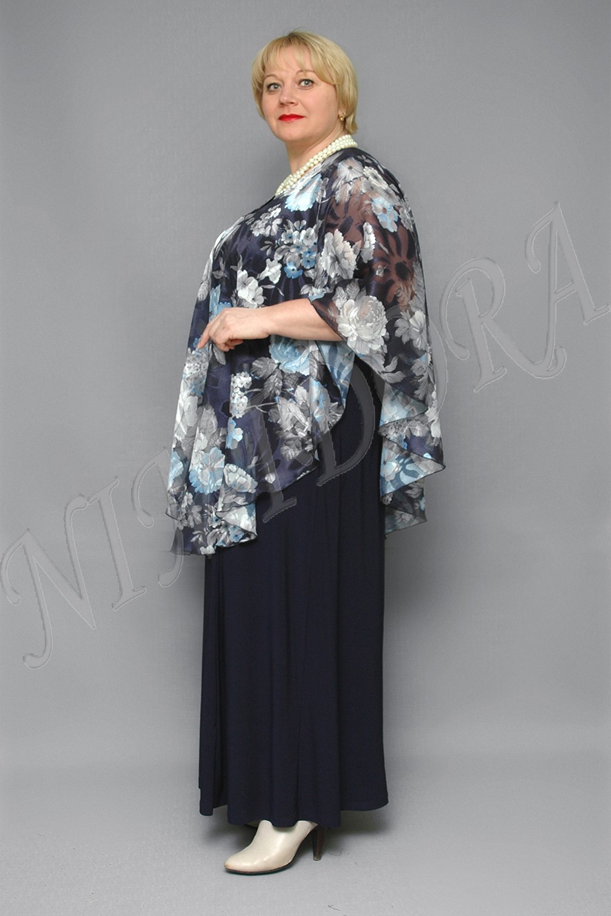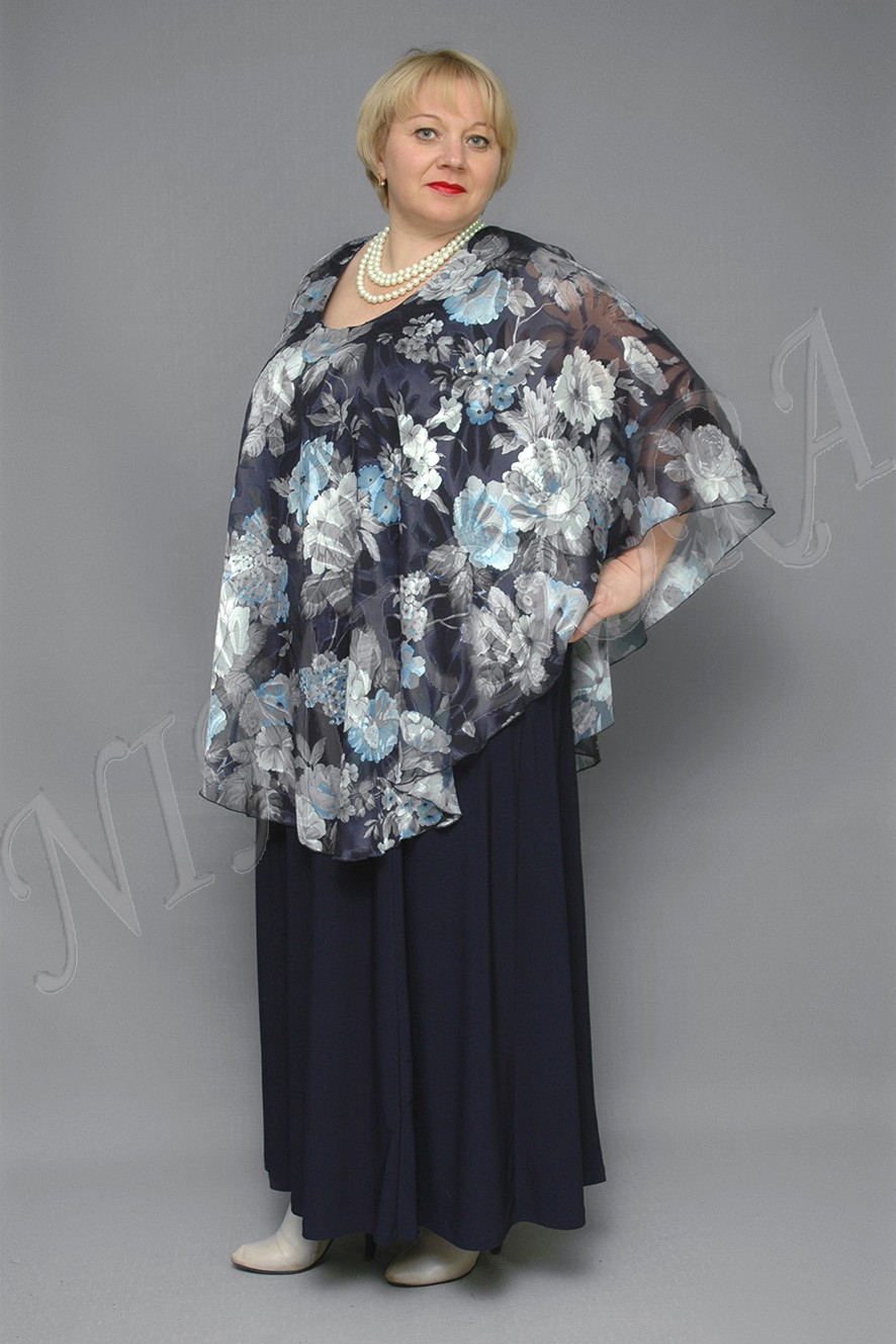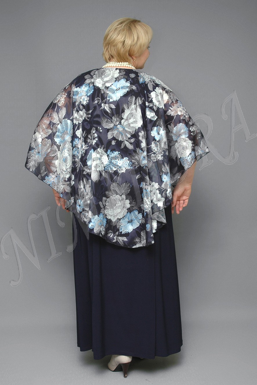 Нарядное платье с накидкой. Платье однотонное, выполнено из тонкой, гладкой, очень эластичной ткани. Накидка из шифона с ярким рисунком. Накидка пришита только по линии выреза и красиво драпируется поверх платья, прикрывая плечи и оставляя свободу движения.