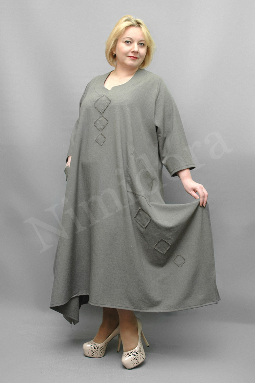 Платье расклешенного силуэта. Вырез полукруглый, с дополнительным разрезиком. Отделан подкройной обтачкой. Перед без вытачек и рельефов, с центральным швом, с накладными карманами. Перед платья декорирован небольшими прямоугольными аппликациями из основной ткани, с бахромой по краям. Спинка с центральным швом. Рукав втачной, укороченный, с одним швом, зауженный книзу. Платье сильно расклешено в боковых швах, благодаря чему создается неравномерная линия низа и эффект мягкой драпировки по бокам. Низ платья и край рукава подвернуты и подшиты. Платье без подплечников.