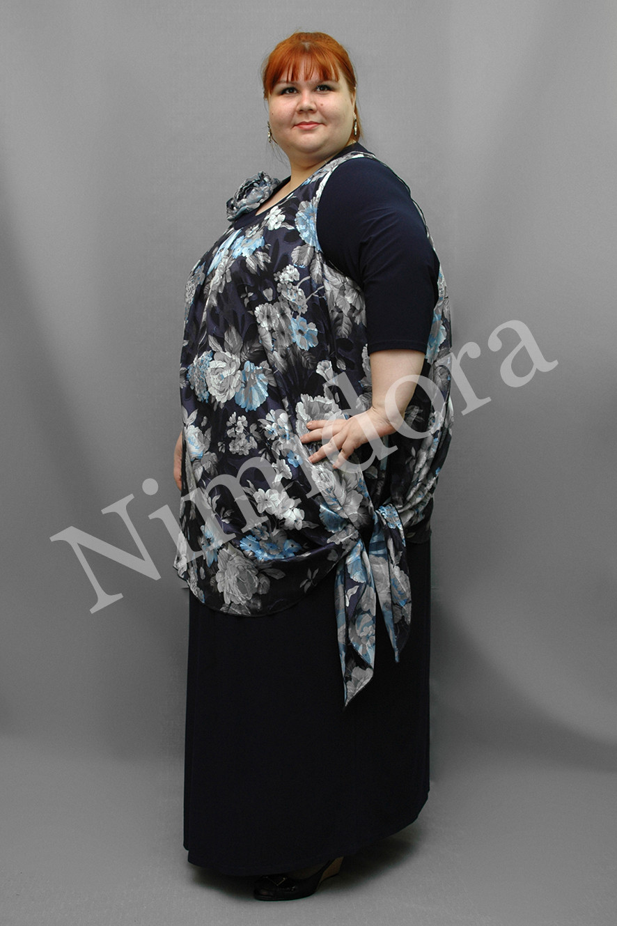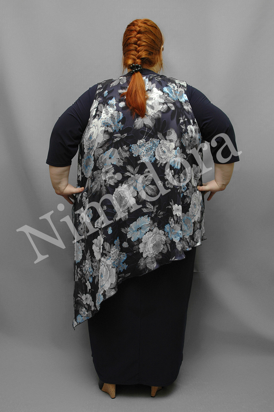 Нарядное платье из тонкого, очень эластичного однотонного трикотажного полотна. Ткань гладкая, "скользящая". Отделка - из шифона с рисунком. Платье прямого силуэта. Вырез полукруглый. Перед и спинка на небольшой полукруглой кокетке. Перед без вытачек и рельефов, спинка с центральным швом. Рукав втачной, короткий, с одним швом, заужен к низу. В шов кокетки вшита декоративная деталь из тонкого, полупрозрачного, неэластичного полотна (шифона) с рисунком (состав ткани: 100 % полиэстер). Шифоновая деталь свободно драпируется поверх основных, трикотажных деталей платья. Шифоновая деталь значительно короче по длине, слегка присборена наверху, под кокеткой. В боковых швах - высокие разрезы. Край ткани по низу, по разрезам боковых швов и по проймам отделан плотным оверлоком до образования легкой волнистости. Линия низа - асимметричная. Платье без подплечников, без разрезов в боковых швах. Платье можно украсить цветком. Цветок в стоимость платья не входит. На модели платье размер 5XL.