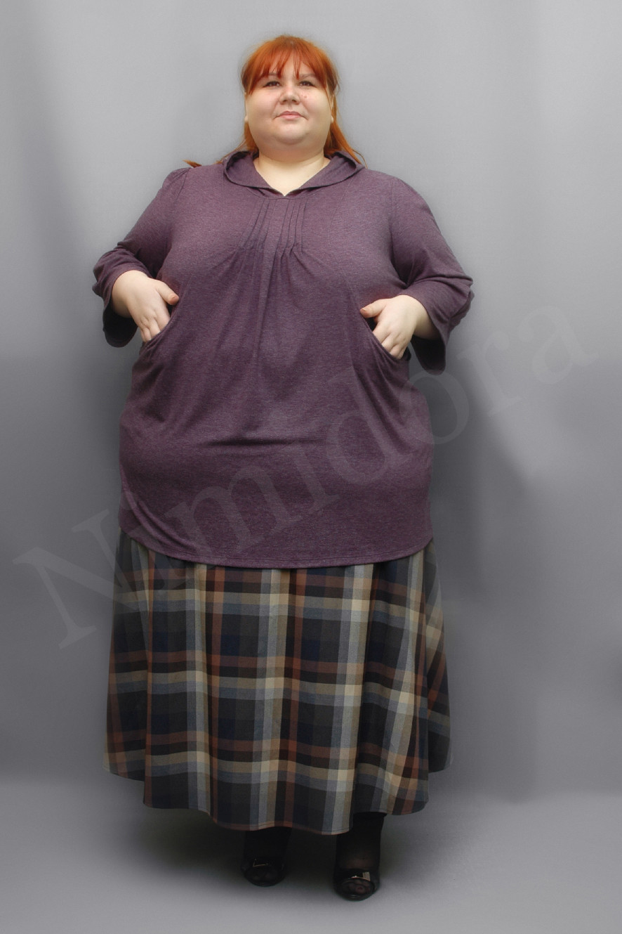 Джемпер с капюшоном из мягкого, бархатистого трикотажного полотна. Полотно меланжевое, приятное на ощупь, очень эластичное, красиво драпируется. Джемпер слегка расклешенного силуэта. Капюшон с одним швом. Под вырезом-небольшая драпировка (складочки застрочены на высоту 15 см). Перед с рельефами от плеча, мягко уходящими в боковые швы. В швах карманы.спинка простая. Рукав втачной, укороченный, с драпировкой. Край рукава и низ джемпера подвернут и подшит двойным эластичным швом. Джемпер без разрезов в боковых швах.