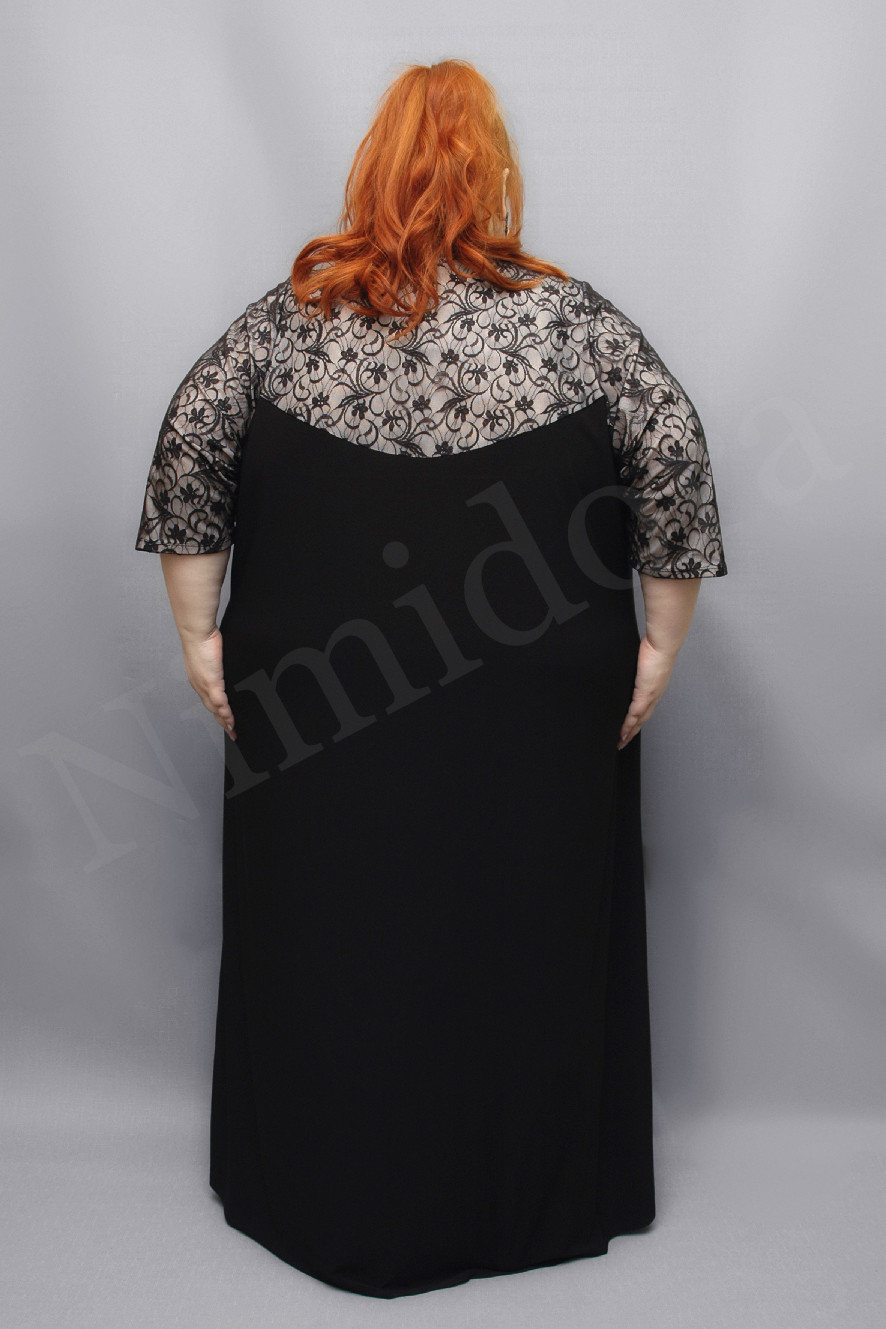 Нарядное платье из эластичного трикотажного полотна. Основная ткань-однотонная, черного цвета, тонкая, мягкая, очень гладкая и шелковистая, "скользящая", практически не мнется. В отделке используется тонкое и мягкое эластичное трикотажное полотно светло-бежевого цвета, покрытое черным эластичным кружевом. Платье прямого силуэта. Полукруглый вырез. Перед и спинка с фигурной кокеткой из отделочного полотна. Основная деталь-без дополнительных швов. Рукав втачной, укороченный, с одним швом, слегка заужен книзу. Платье без подплечников, без разрезов в боковых швах.