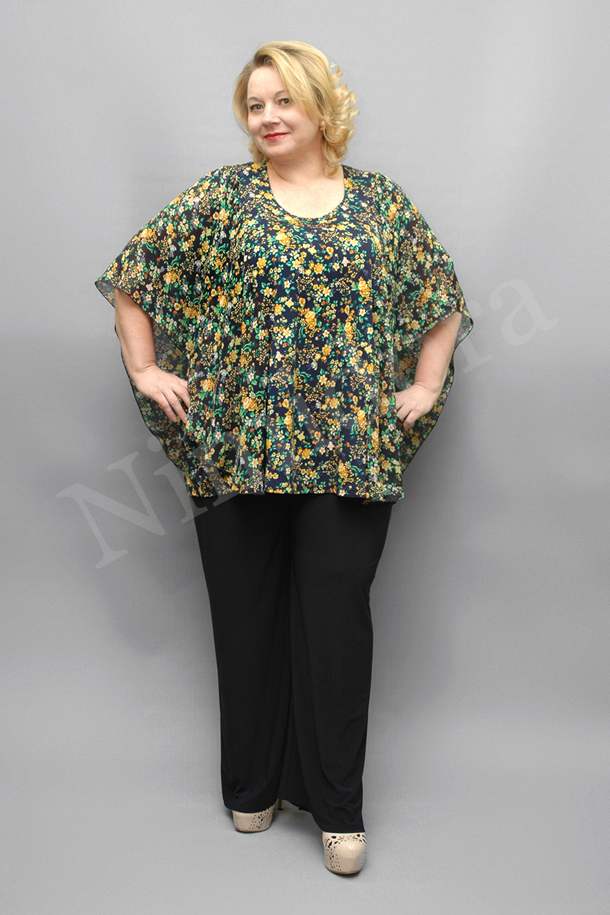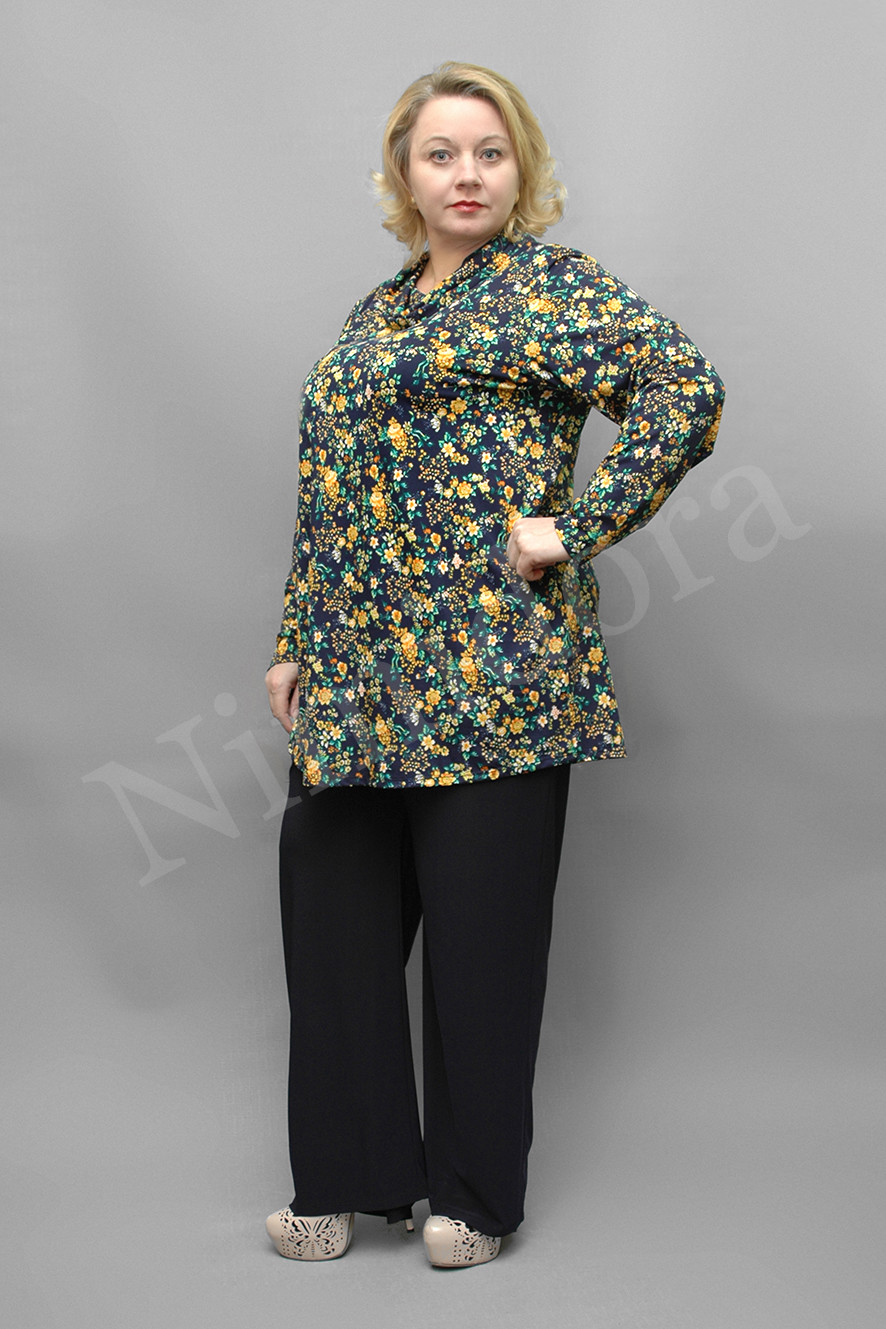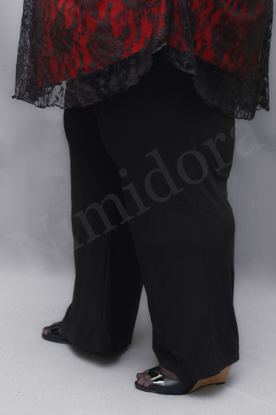 Верхний край подвернут и подшит, внутрь вставлена удобная, широкая регулируемая резинка. Штанины слегка заужены книзу.Брюки без карманов. Низ подвернут на 2 см и подшит двойным эластичным швом. На модели брюки размер 5XL.