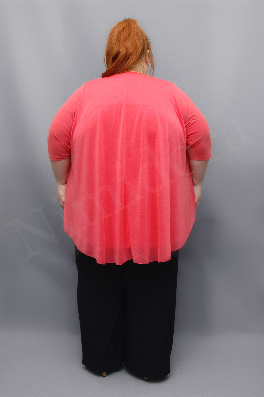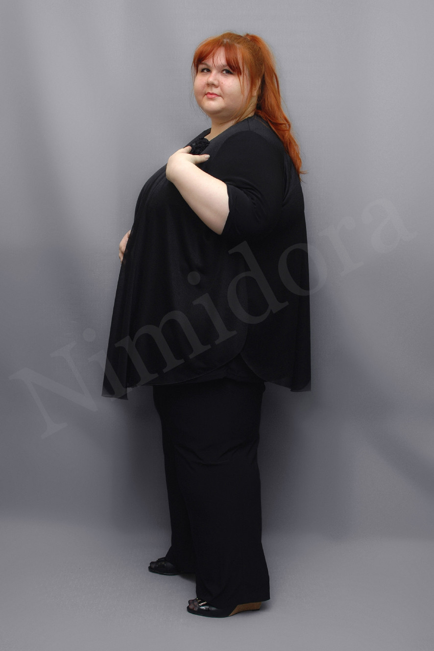 Нарядная блуза из тонкого, гладкого, эластичного трикотажного полотна(масло). Поверх переда и спинки нашиты детали из полупрозрачного немного эластичного полотна. Детали из шифона пришиты к блузе по швам выреза горловины, проймам и небольшому участку бокового шва от нижней точки проймы. Блуза слегка расклешенного силуэта. Полукруглый вырез. Перед блузы и деталь из шифона- без вытачек и рельефных швов. Спинка с центральным швом. Рукав втачной, укороченный, с одним швом, слегка заужен книзу. Низ блузы и край рукава подвернут и подшит двойным эластичным швом. Все края деталей из шифона мягко закруглены и обработаны плотным оверлоком. Блуза декорирована оригинальной брошью в форме цветка хризантемы. Брошь пристегнута на булавку.