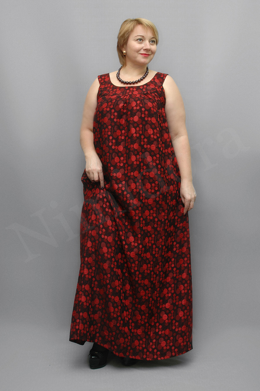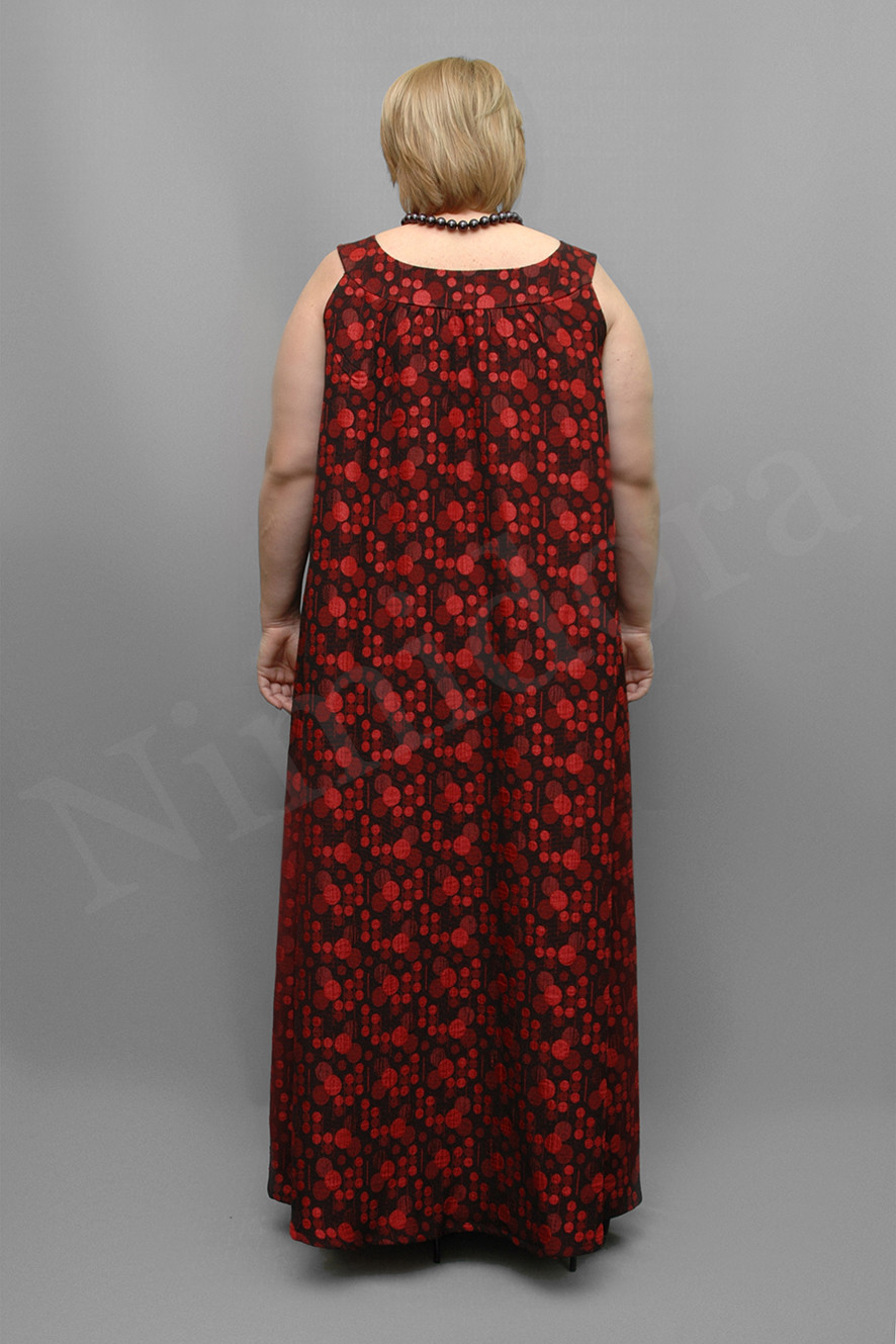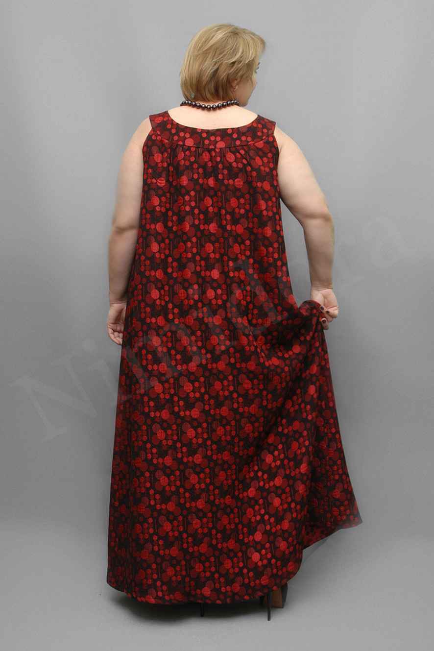 Платье без рукавов, из не эластичного,фактурного, плотного, легкого, не прозрачного полотна. Платье расклешенного силуэта.Перед и спинка на полукруглой кокетке, от кокетки по центру ткань присборена. Перед с рельефными швами от кокетки, спинка без центрального шва.