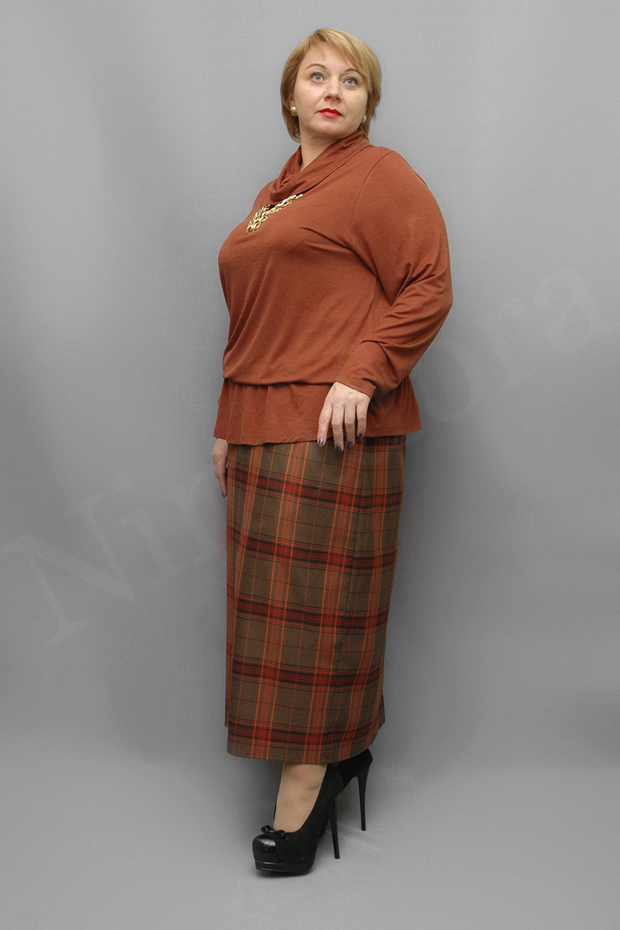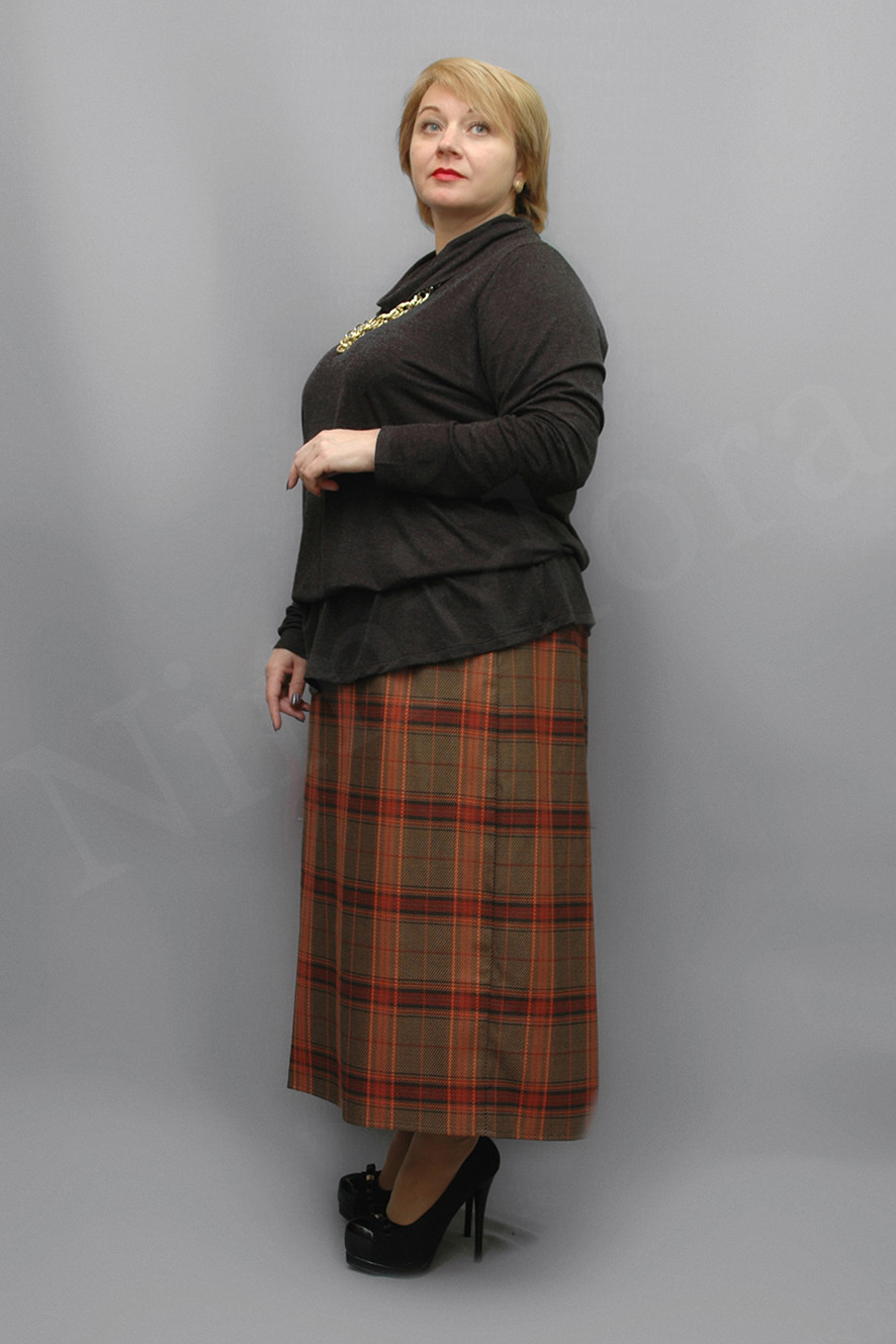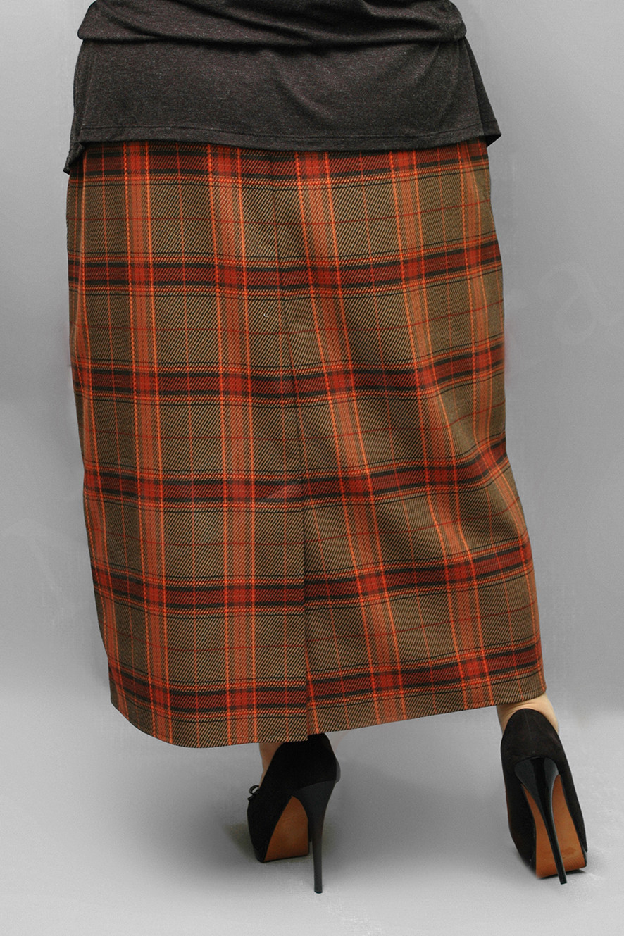 Элегантная юбка из мягкой плотной неэластичной ткани в крупную клетку. Юбка прямого силуэта. Пояс притачной. Внутрь вставлена широкая регулируемая резинка. Передняя деталь без швов и дополнительных деталей. Задняя деталь с центральным швом, со шлицей высотой 25 см. Передняя деталь юбки- на подкладке из тонкой и гладкой подкладочной ткани. Подкладка пришита только по шву пояса и боковым швам. Низ подвернут и подшит на 3 см. Юбка без застежки, без карманов.