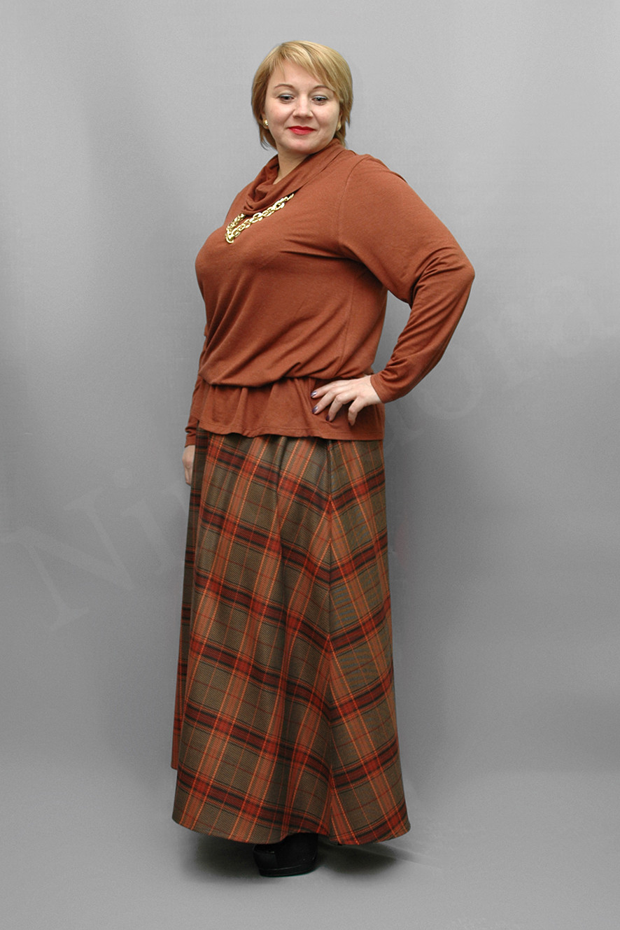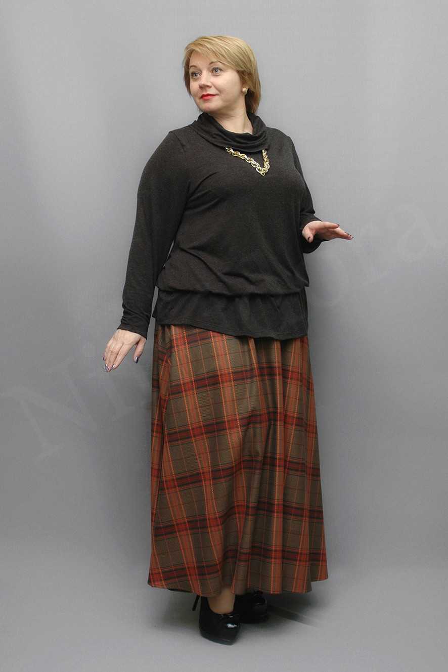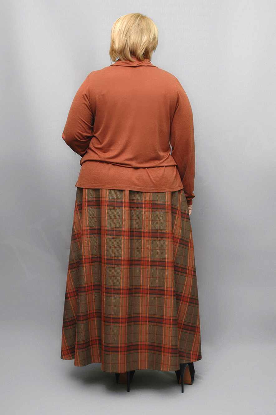 Юбка из мягкой и плотной неэластичной ткани в крупную клетку. Юбка слегка расклешенного силуэта, с двумя боковыми швами. Притачной пояс. Внутрь вставлена широкая регулируемая резинка. Юбка без застежки, без карманов, без подкладки. низ подвернут и подшит на 1,5 см.