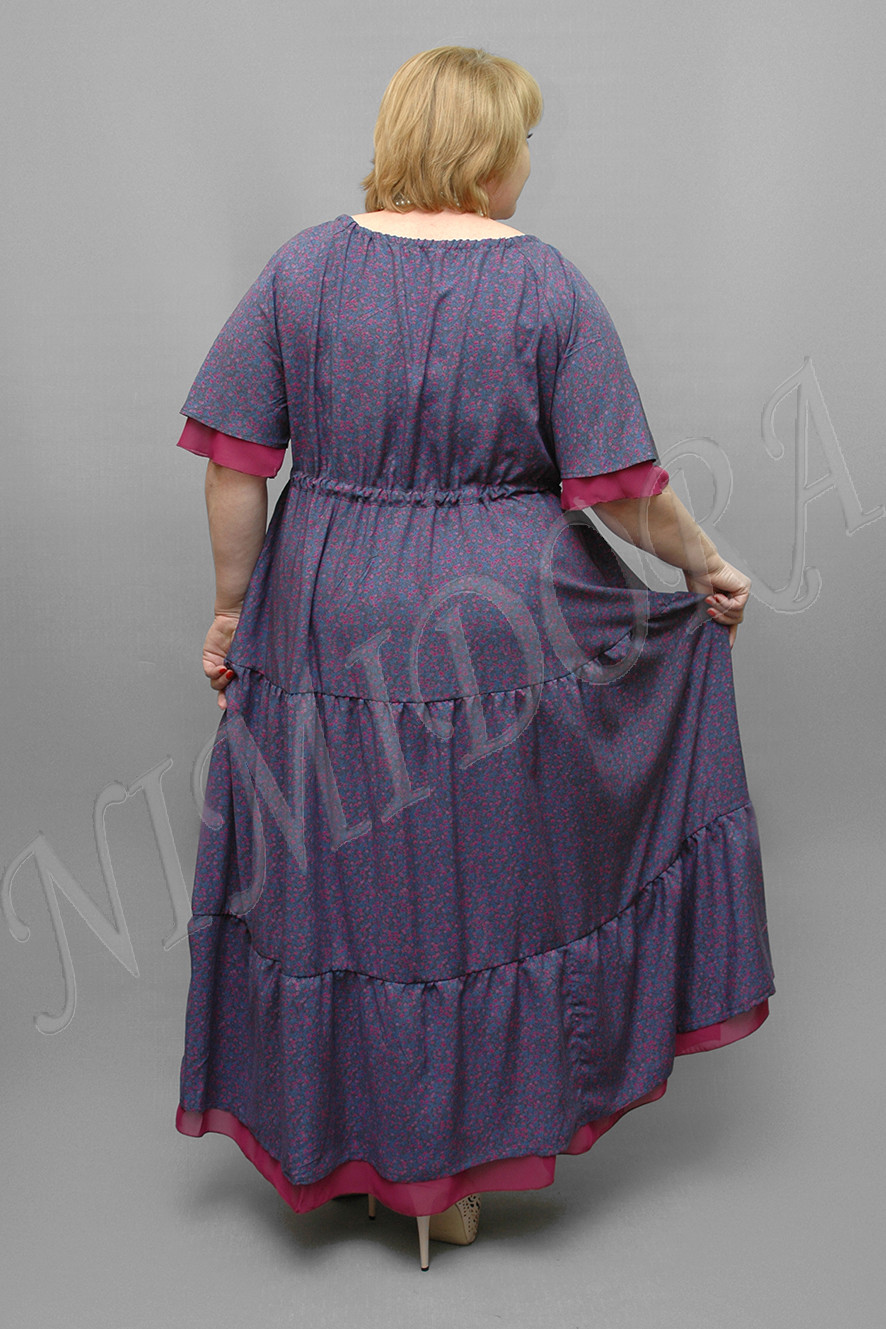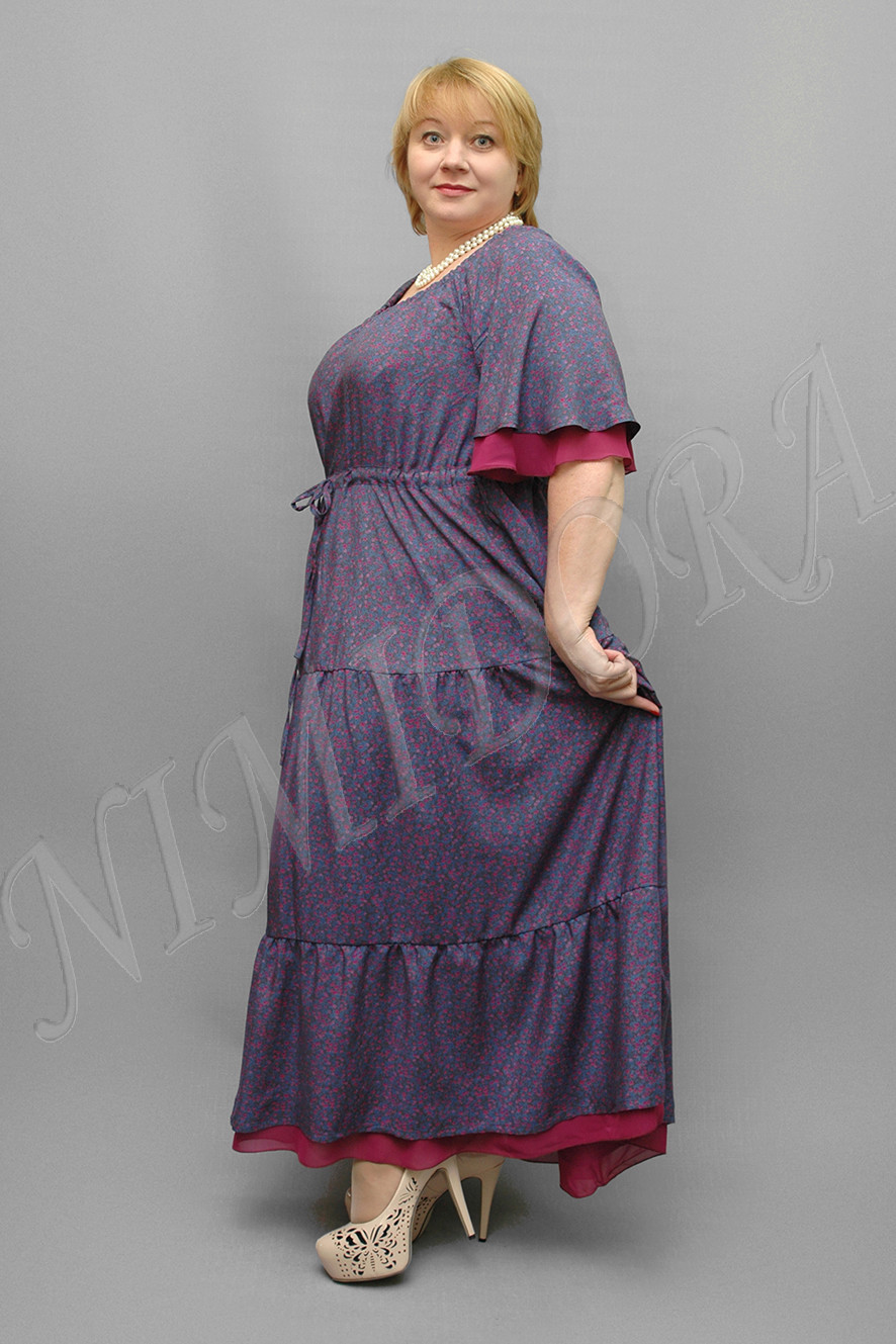 Платье слегка расклешенного силуэта. Полукруглый вырез присобран на резиночку. Платье отрезное под грудью. По линии отреза сделана кулиска с тесемкой из основного полотна. Нижняя часть сарафана состоит из двух ярусов, слегка присборенных по швам. Рукав реглан, короткий, расклешенный. Рукав и нижний ярус отделаны шифоном.