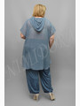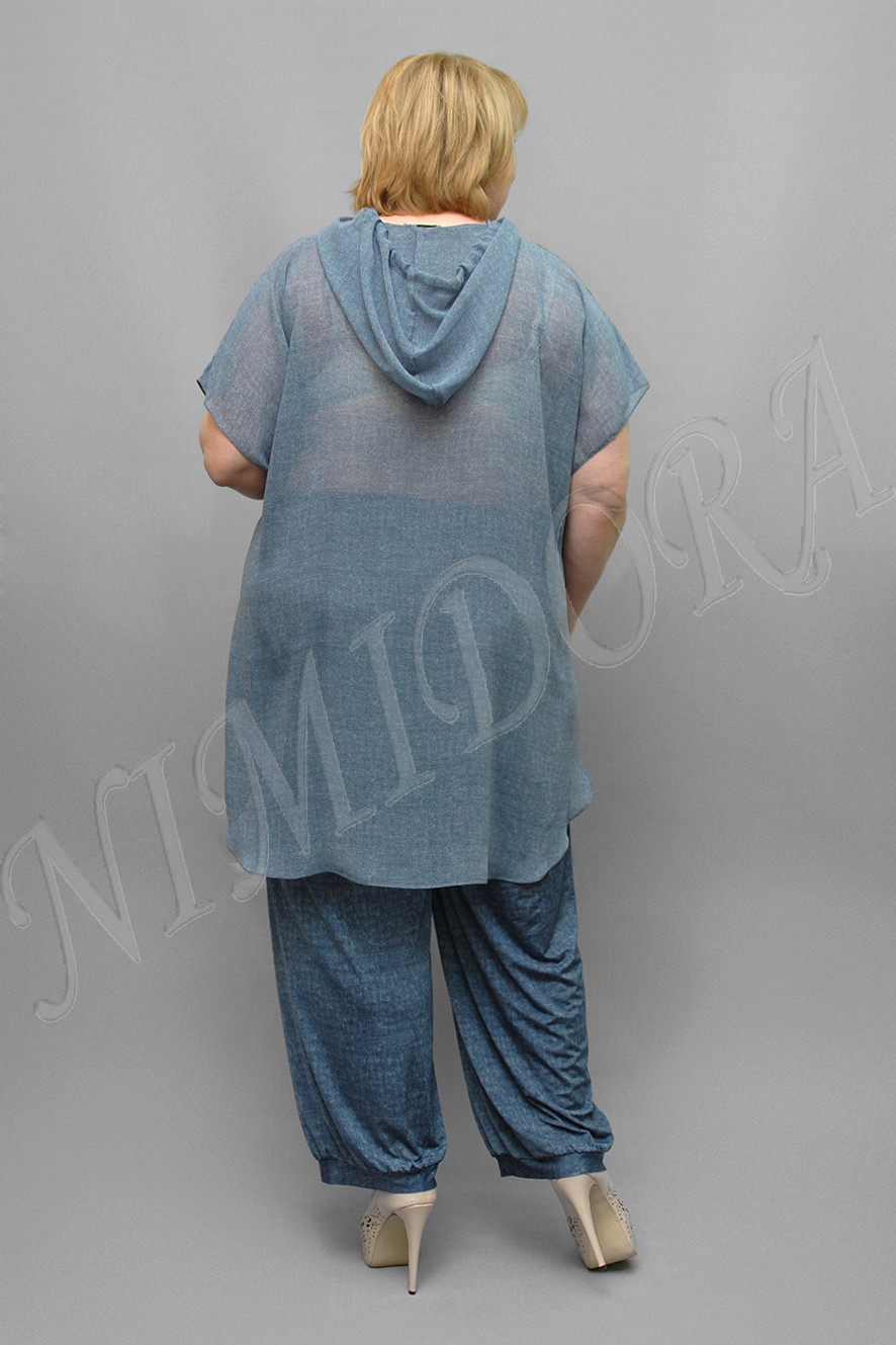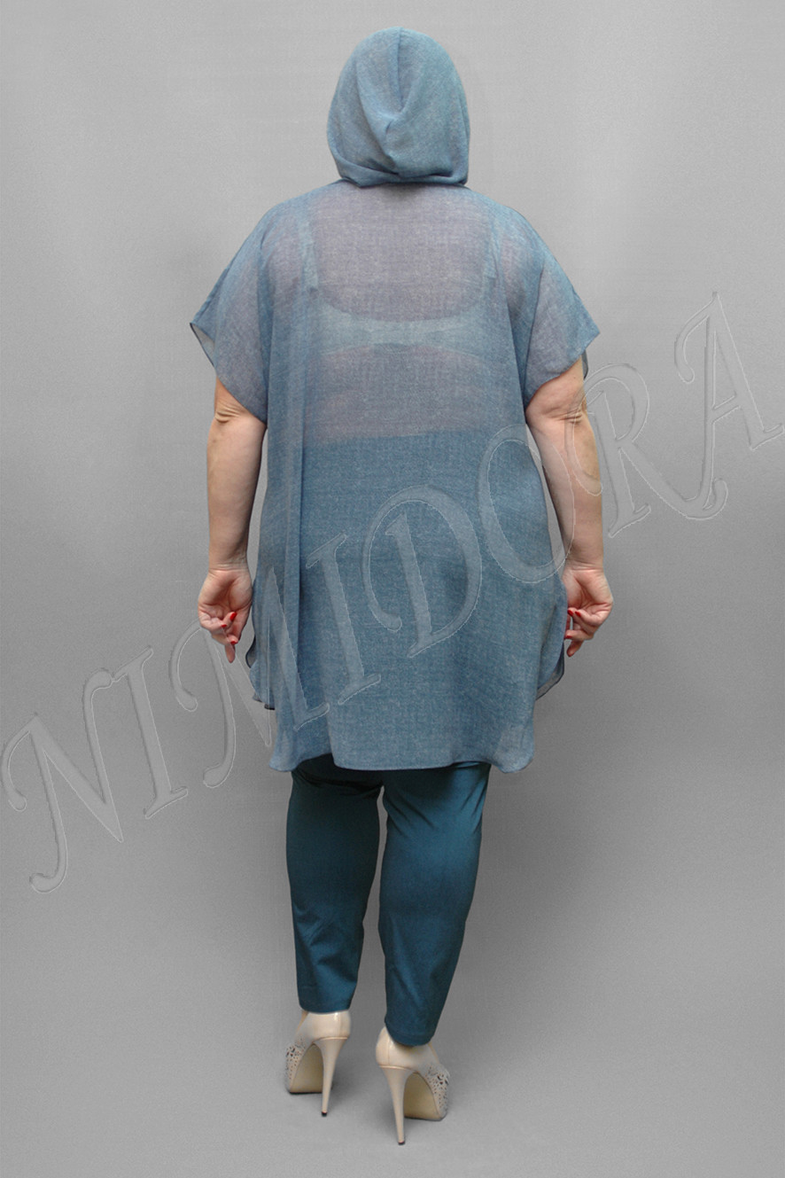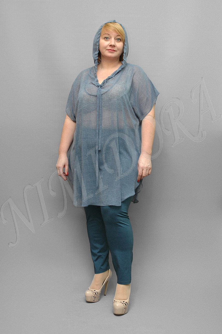 Легкая воздушная туника из шифона с красивым рисунком. Имитация джинсовой ткани. Туника прямого силуэта с удлиненной линией плеча. Глубокий полукруглый вырез декорирован широкой круговой деталью, которая сзади образует капюшон с кулиской по краю. Спинка простая без центрального шва. Линия низа мягко закругляется к боковым швам. Туника немного просвечивается.