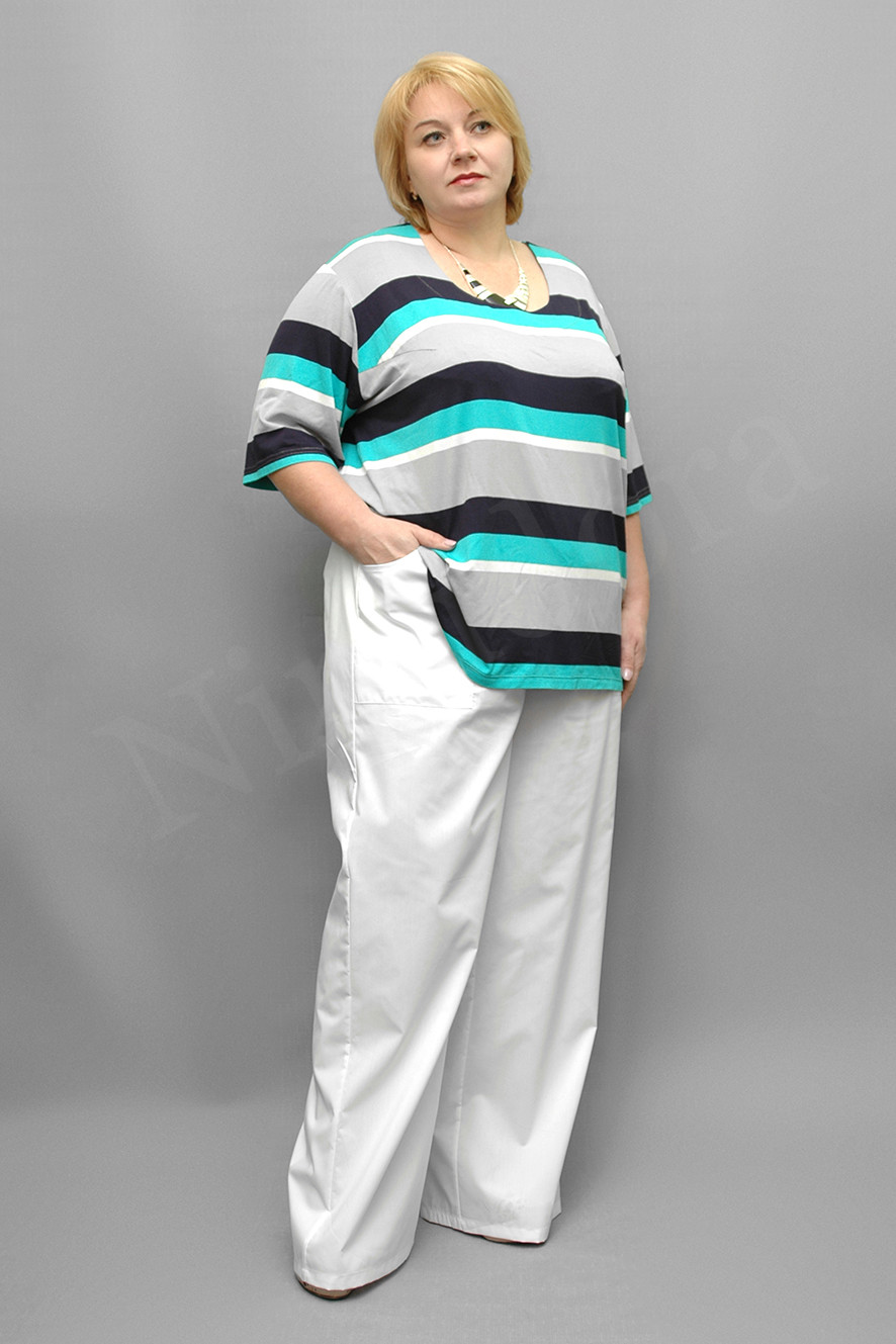 Брюки без застежки, с широкими прямыми штанинами. Пояс притачной, на широкой регулируемой резинке. Перед с одинарными вытачками, с накладными карманами с боковым входом. Задняя часть на кокетке, с одинарными вытачками от кокетки, без карманов. Штанины широкие, прямые. Нижний край подвернут на 2 см.