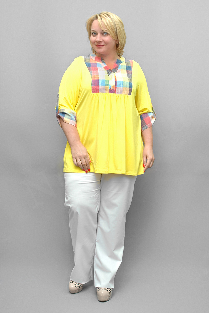 Замечательная, очень комфортная удлиненная блуза из мягкого эластичного трикотажного полотна. Блуза слегка расклешенного силуэта. Вырез полукруглый с дополнительным разрезом и планкой, застегивающейся на пуговки. Воротник - небольшая стойка. Перед и спинка на кокетке. Воротник и кокетка из тонкой, неэластичной ткани в клетку.От кокетки ткань присборена. Рукав втачной, укороченный, с манжетой. Замечательная деталь-пата с застежкой на пуговицу, при помощи которой можно задрапировать рукав. Нижний край блузы подвернут и подшит двойным эластичным швом. Блуза без подплечников, без карманов, без разрезов.