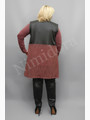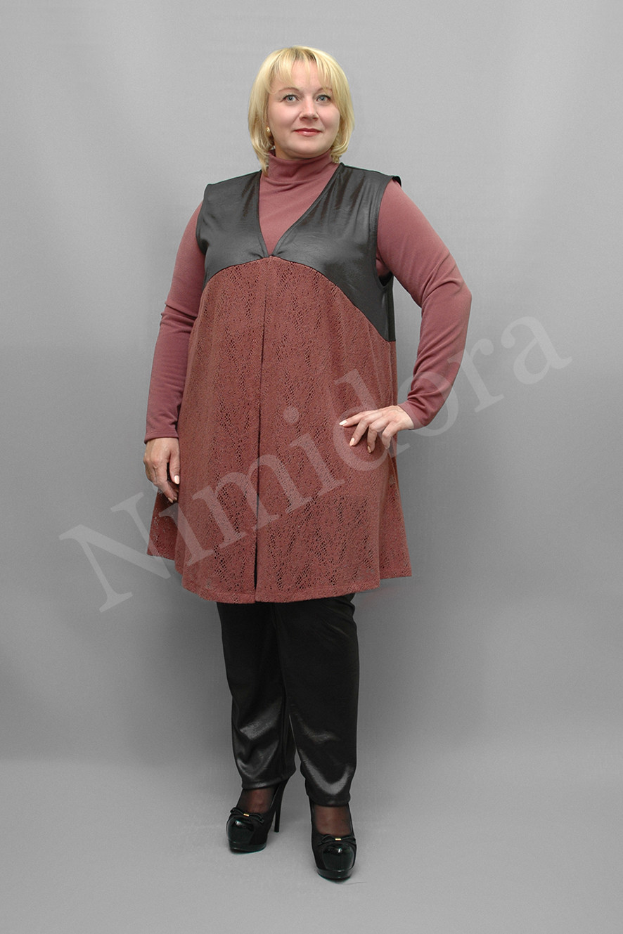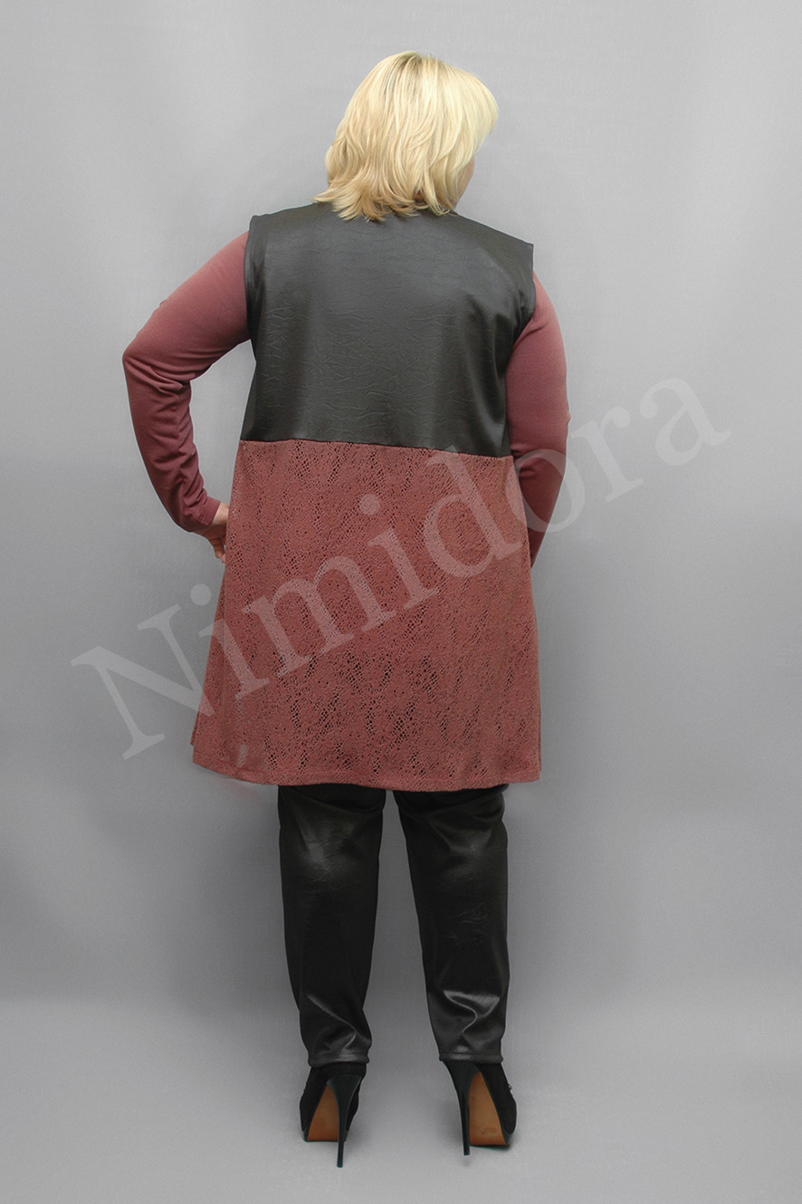 Нарядный жилет из двух видов ткани. Одна ткань - тонкое, мягкое и гладкое эластичное полотно с матовым блеском, похожее по виду на искусственную кожу. Другая- слегка эластичное вязаное полотно.
