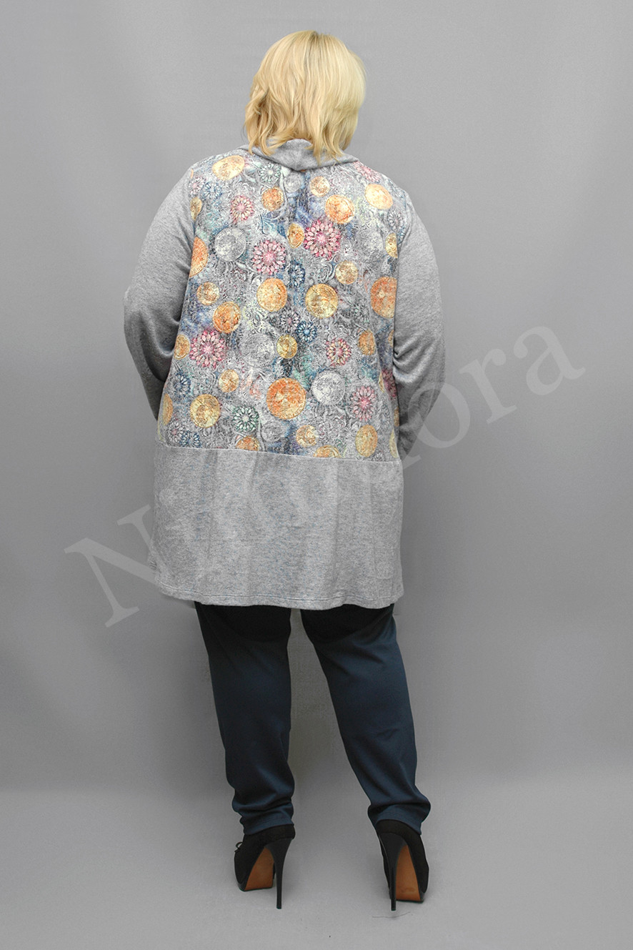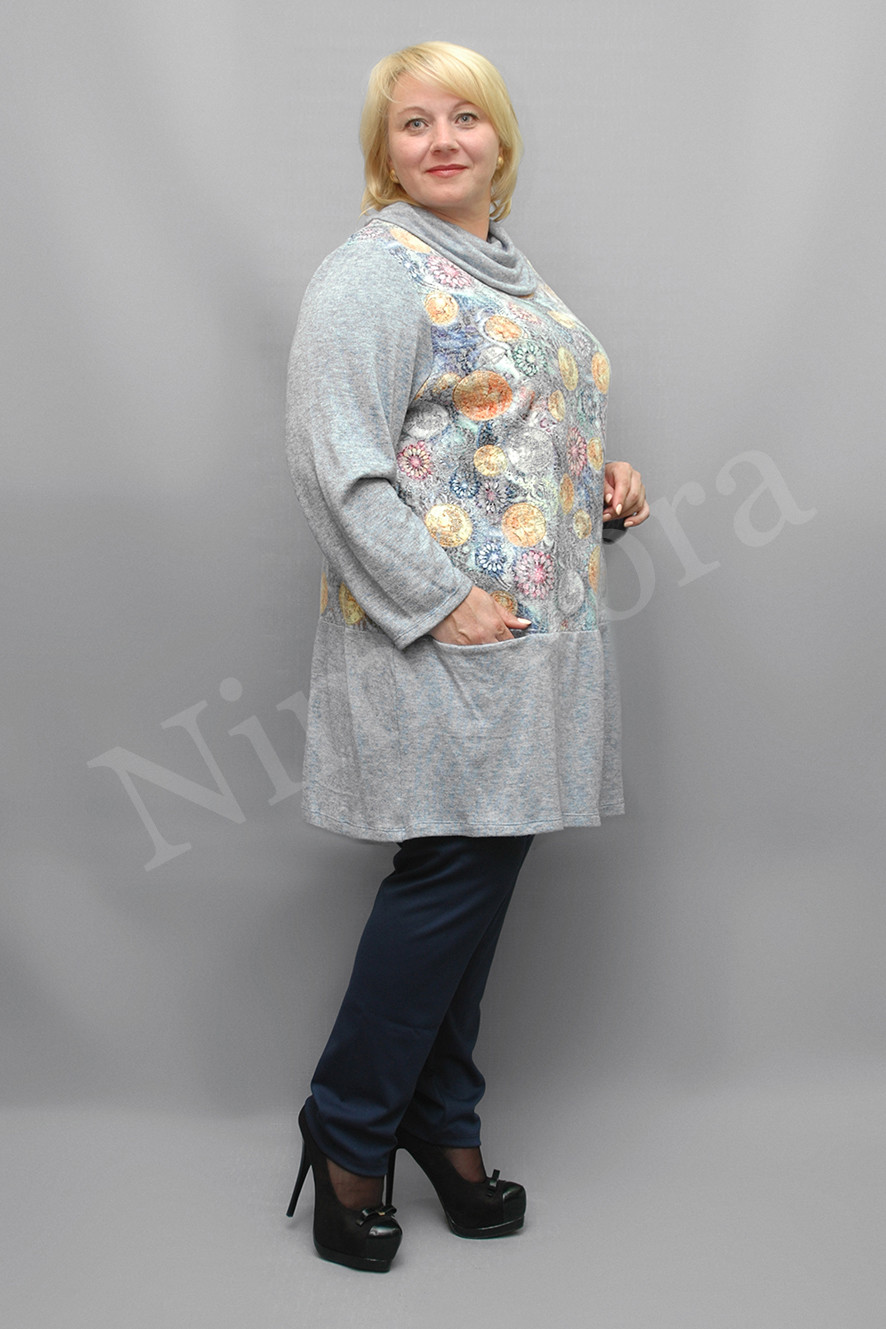 Туника из теплого,плотного, мягкого, вязаного полотна .Туника прямого силуэта. Нижняя отрезная часть туники, воротник и рукав из вязанного однотонного полотна. Рукав длинный, ровный из отделочной ткани.Туника без разрезов в боковых швах, без подплечников, в шве спереди .небольшой карманчик.