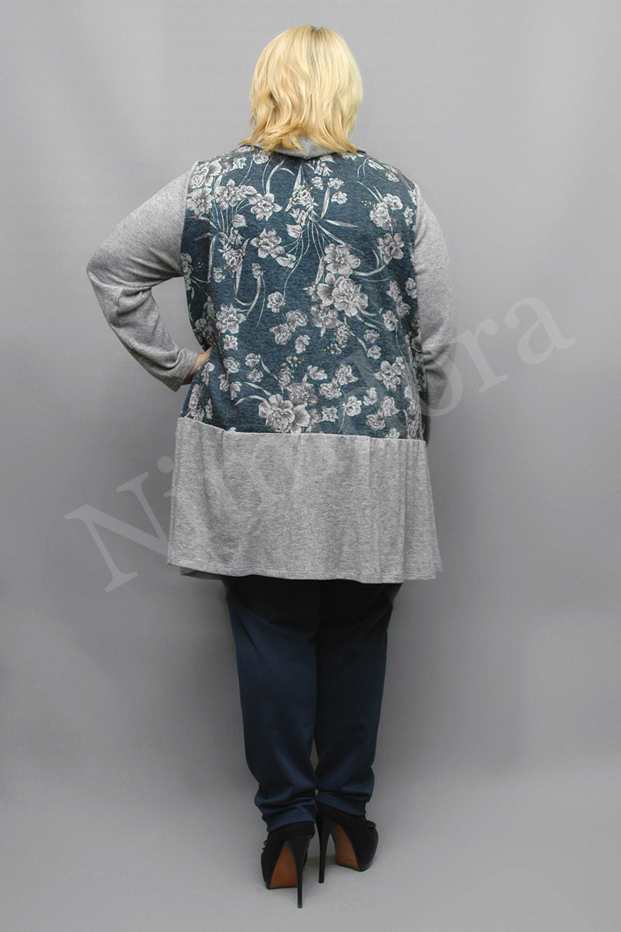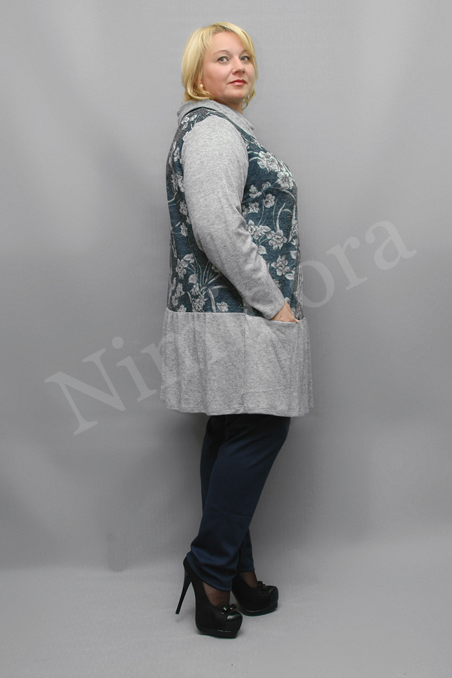 Туника из плотного, мягкого, эластичного трикотажного полотна .Туника прямого силуэта. Нижняя отрезная часть туники, воротник и рукав из вязанного полотна. Рукав длинный, ровный из отделочной ткани.Туника без разрезов в боковых швах, без подплечников, в шве спереди .небольшой карманчик.