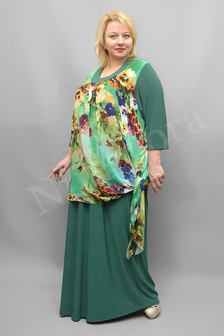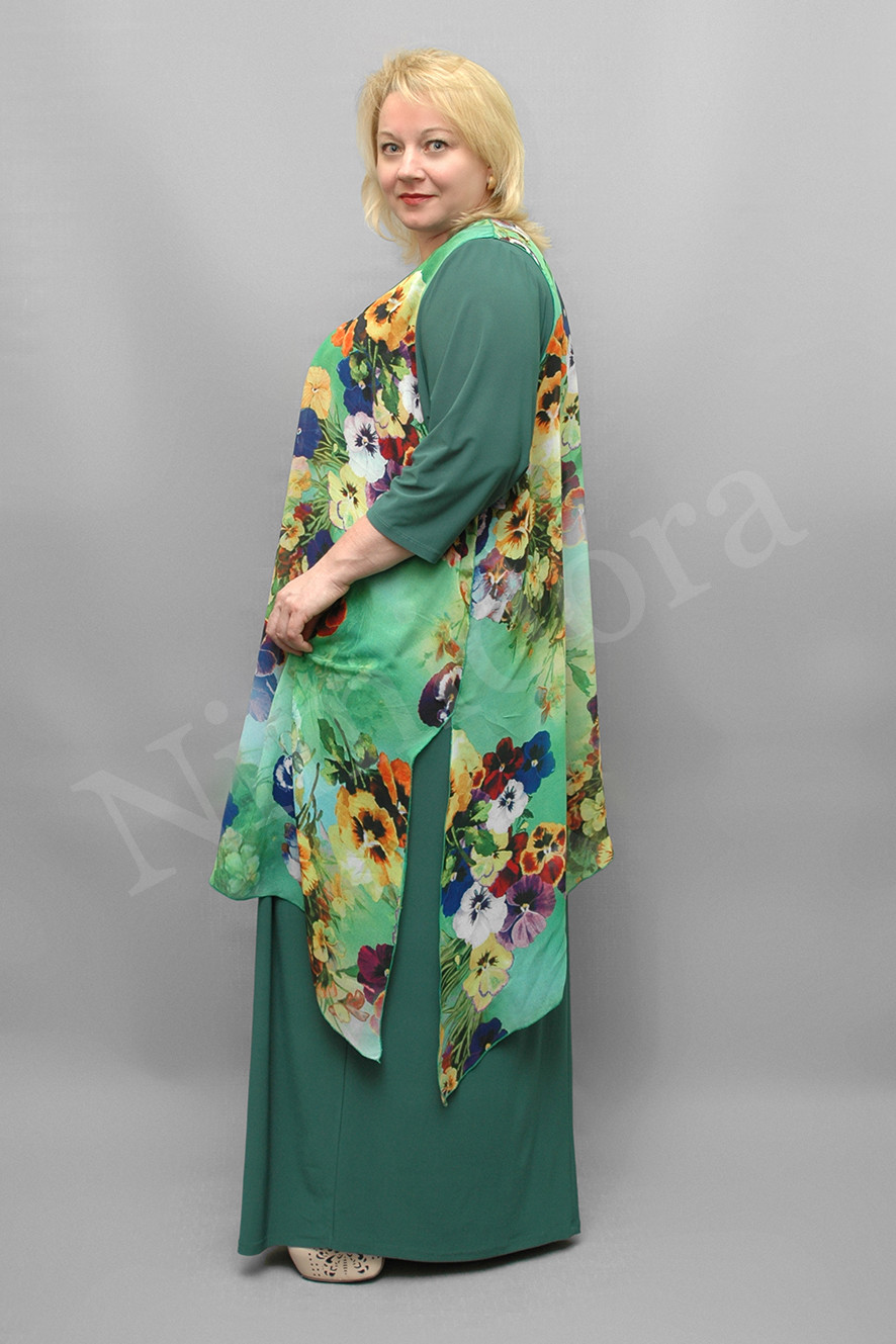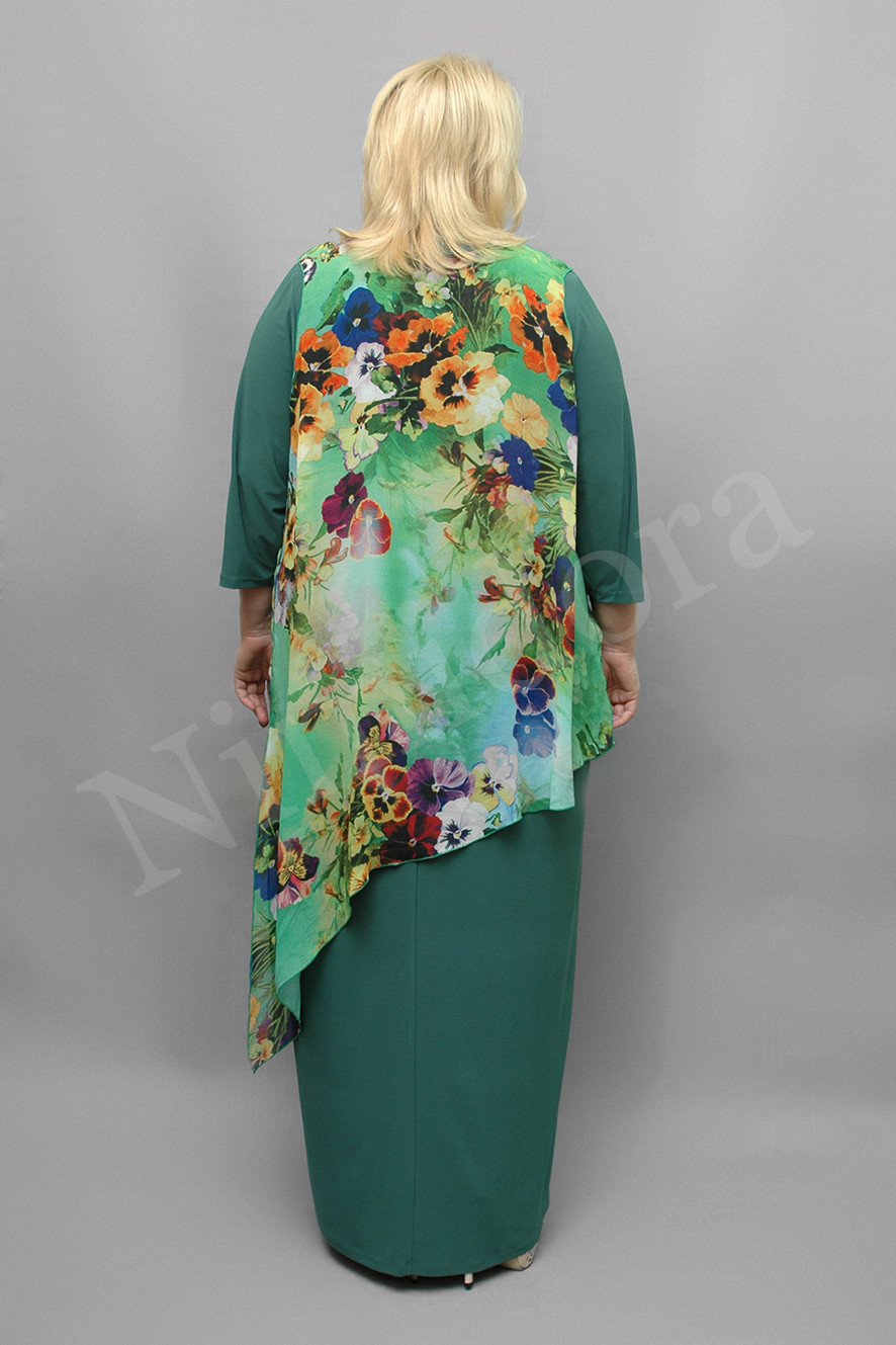 Нарядное платье из тонкого, очень эластичного однотонного трикотажного полотна. Ткань гладкая, "скользящая". Отделка - из шифона с рисунком. Платье прямого силуэта. Вырез полукруглый. Перед и спинка на небольшой полукруглой кокетке. Перед без вытачек и рельефов, спинка с центральным швом. Рукав втачной, короткий, с одним швом, заужен к низу. В шов кокетки вшита декоративная деталь из тонкого, полупрозрачного, неэластичного полотна (шифона) с рисунком (состав ткани: 100 % полиэстер). Шифоновая деталь свободно драпируется поверх основных, трикотажных деталей платья. Шифоновая деталь значительно короче по длине, слегка присборена наверху, под кокеткой. В боковых швах - высокие разрезы. Край ткани по низу, по разрезам боковых швов и по проймам отделан плотным оверлоком до образования легкой волнистости. Линия низа - асимметричная. Платье без подплечников, без разрезов в боковых швах.