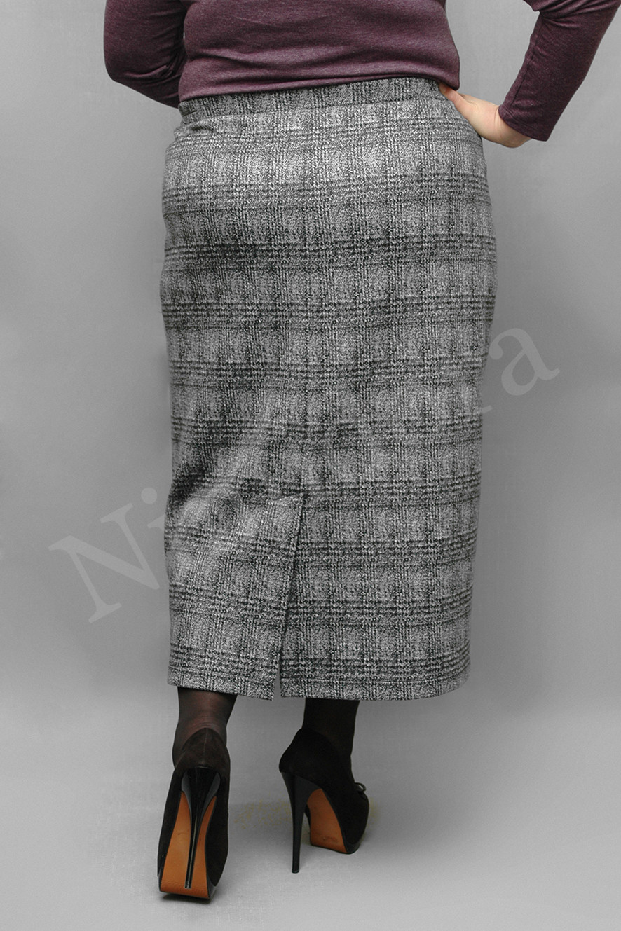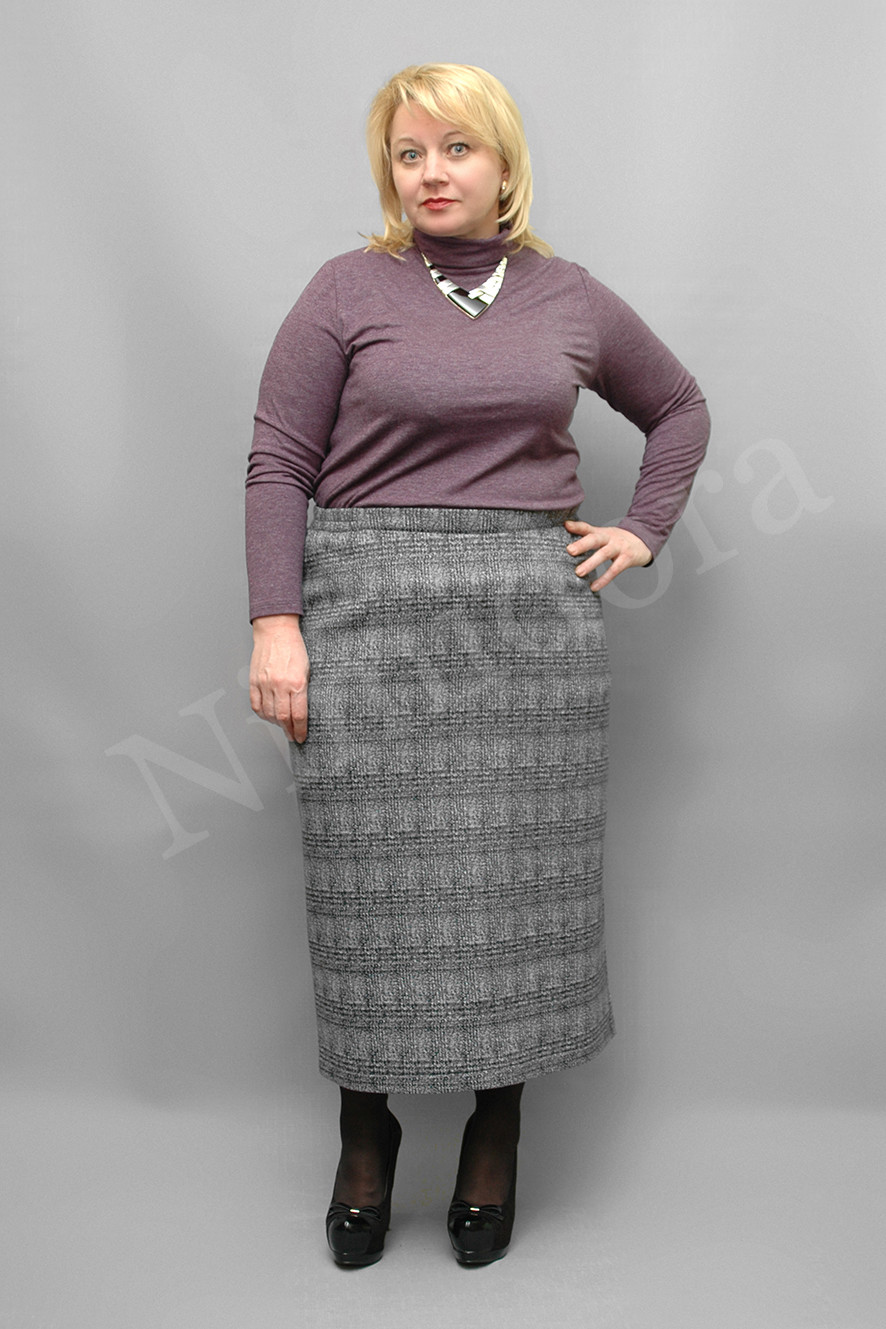 Элегантная юбка из мягкой плотной неэластичной ткани в клетку. Юбка прямого силуэта. Пояс притачной. Внутрь вставлена широкая нерегулируемая резинка. Передняя деталь без швов и дополнительных деталей. Задняя деталь с центральным швом, со шлицей высотой 25 см. Передняя деталь юбки- на подкладке из тонкой и гладкой подкладочной ткани. Подкладка пришита только по шву пояса и боковым швам. Низ подвернут и подшит на 3 см. Юбка без застежки, без карманов.