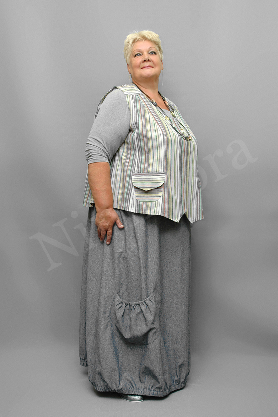 Юбка из мягкой и плотной неэластичной ткани.. Юбка слегка расклешенного силуэта, с двумя боковыми швами. Притачной пояс. Внутрь вставлена широкая регулируемая резинка. Юбка без застежки, без подкладки. В боковых швах карманы. Спереди еще один накладной декоративный карман. По низу вставлена резинка.Цвет: (песочный -полоска светлая),( серый -полоска серая), (темно-серый -однотонный).