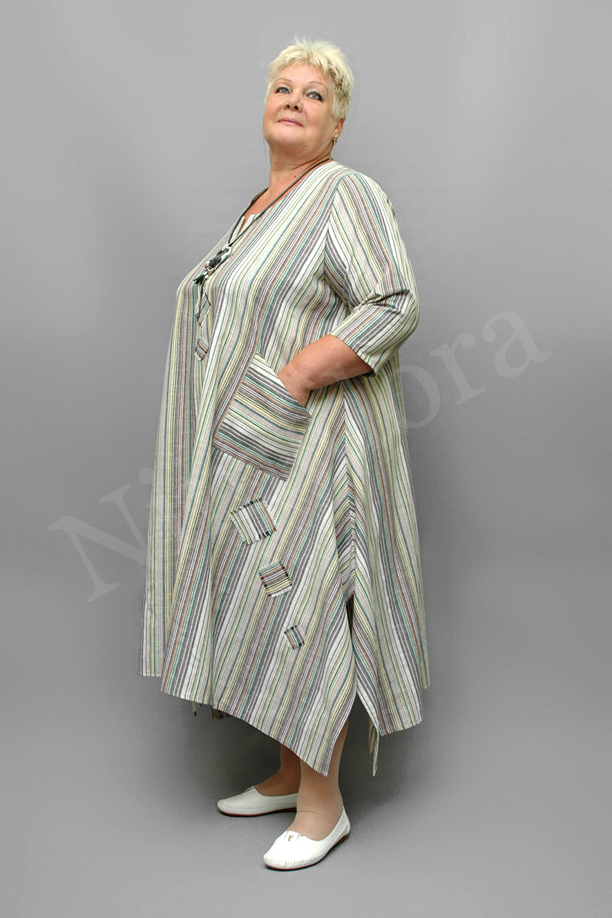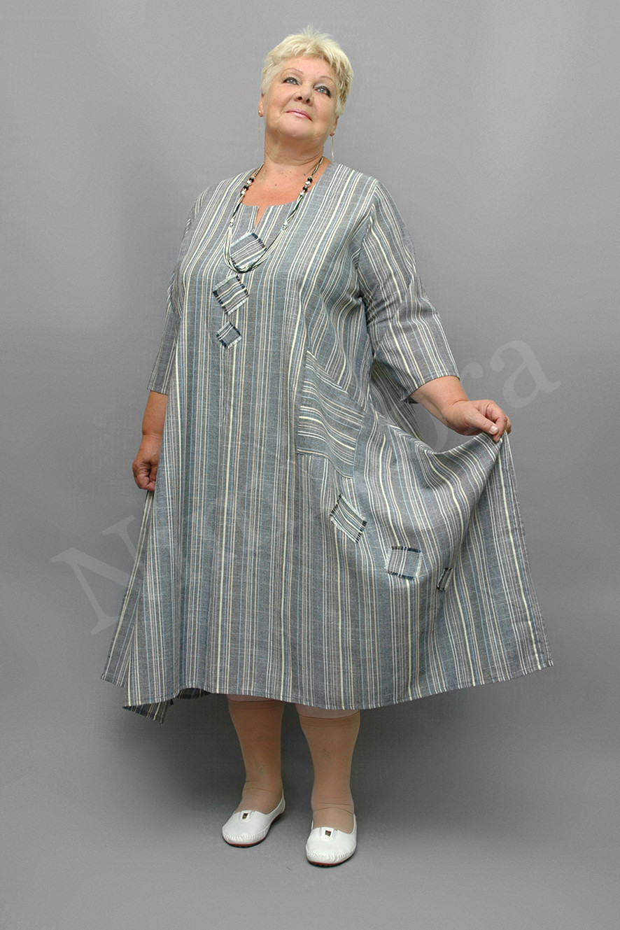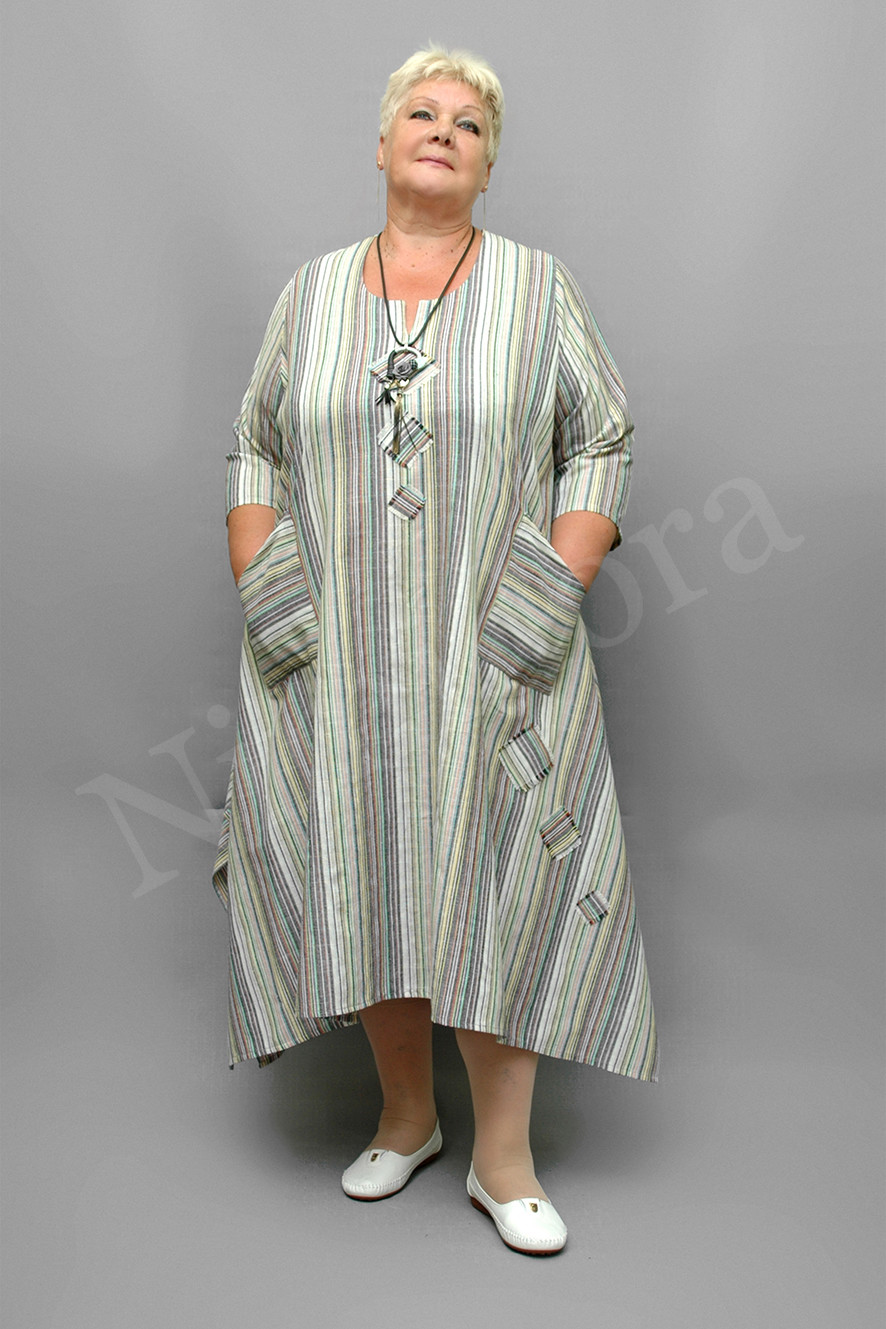 Платье расклешенного силуэта.Вырез полукруглый, с дополнительным разрезиком. Отделан подкройной обтачкой.Перед без вытачек и рельефов, с центральным швом, с накладными карманами. Карманы нашиты с горизонтальными расположением полос на ткани. Перед платья декорирован небольшими прямоугольными аппликациями из основной ткани, с бахромой по краям.Спинка с центральным швом.Рукав втачной, укороченный, с одним швом, зауженный книзу.Платье сильно расклешено в боковых швах, благодаря чему создается неравномерная линия низа и эффект мягкой драпировки по бокам.Низ платья и край рукава подвернуты и подшиты.Платье без подплечников.