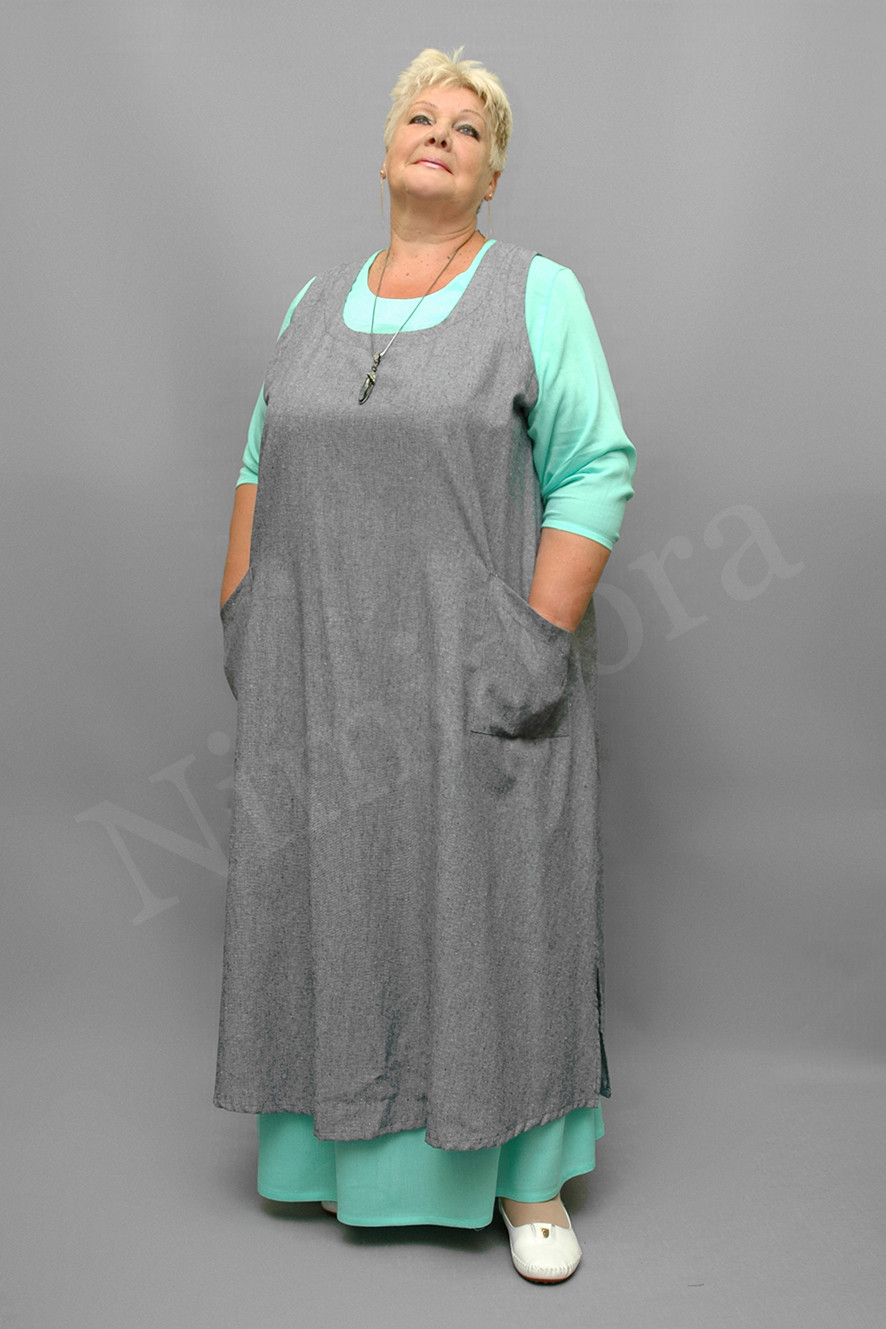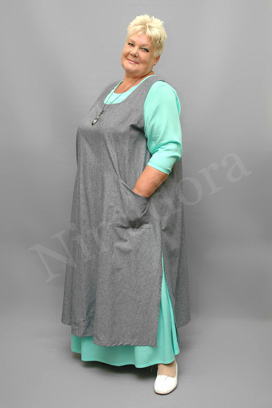 Накидка из плотной и мягкой, неэластичной ткани. Сарафан расклешенного силуэта.Полукруглый вырез.По вырезу и проймам ткань подвернута и подшита.Перед без вытачек и рельефов, спинка с центральным швом Спереди накладные карманы..В боковых швах - высокие разрезы.
