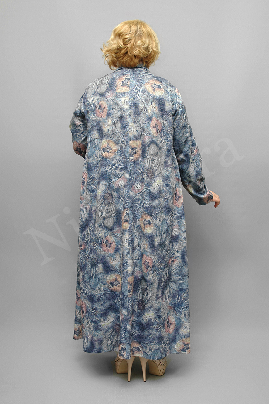 Платье прямого силуэта. Воротник с отворотом, с запахивающимися деталями. Перед без вытачек и рельефов. Спинка простая. Рукав втачной, длинный с одним швом. Край рукава и низ платья подвернуты и подшиты двойным эластичным швом. Платье без подплечников, без разрезов в боковых швах. Цвет сиреневый с синим.