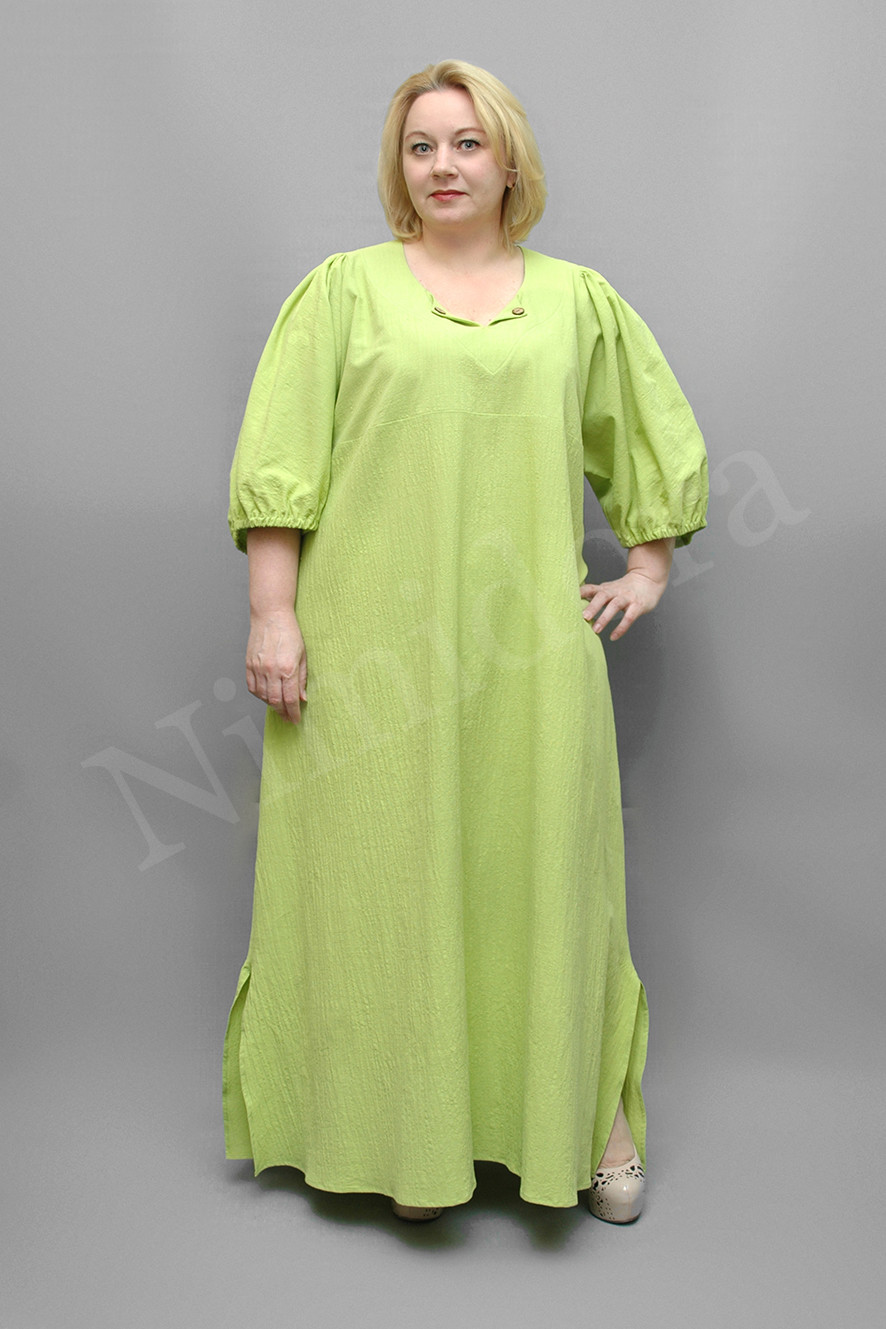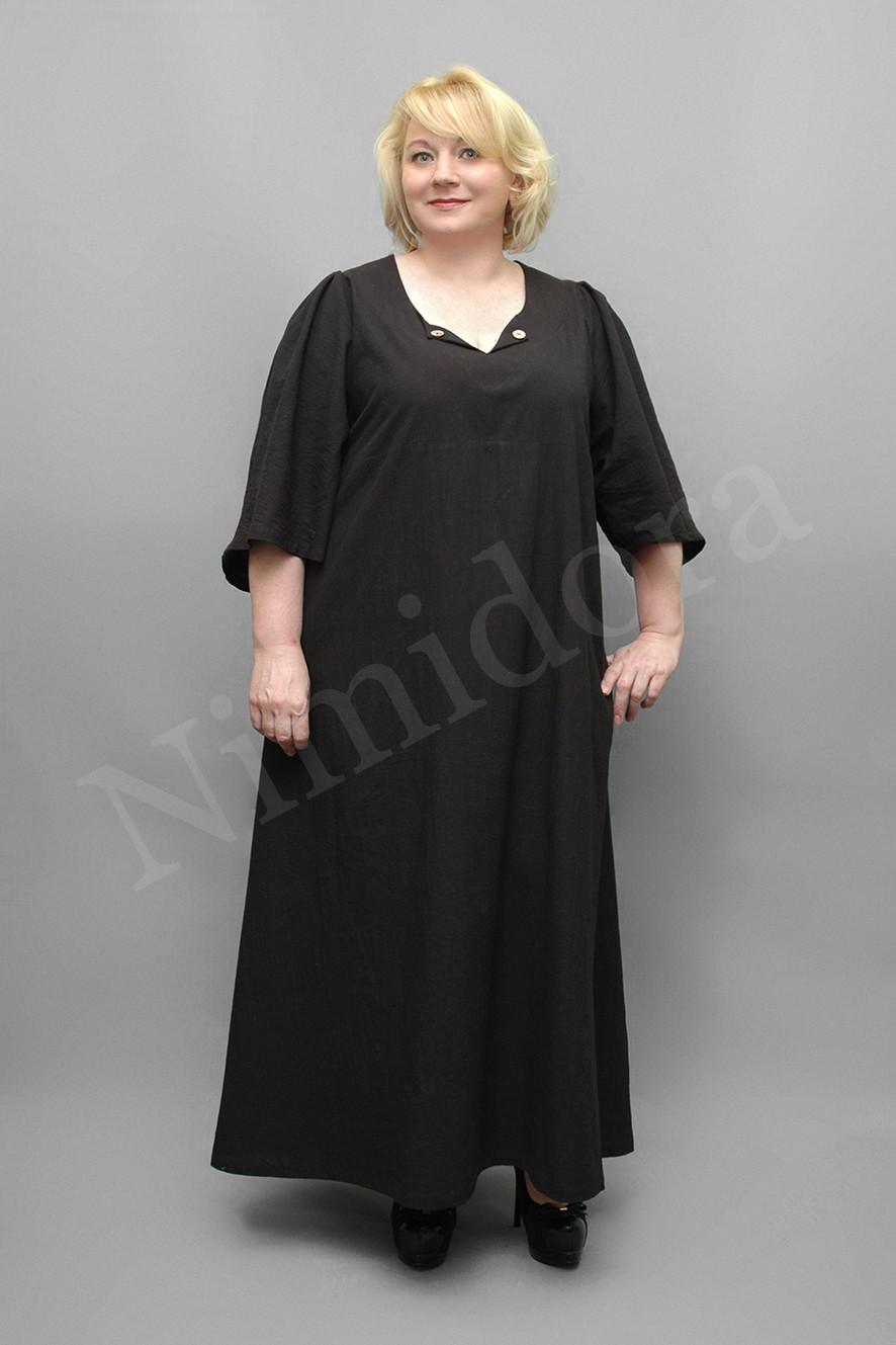 Платье слегка расклешенного силуэта. Фигурный вырез отделан подкройной обтачкой и декорирован двумя пуговицами. Перед и спинка на прямой кокетке. Рукав, цельнокройный с кокеткой, с двумя швами, широкий - подойдет на полные руки. Низ рукава присобран на резиночку. Низ платья подвернут и подшит.
