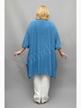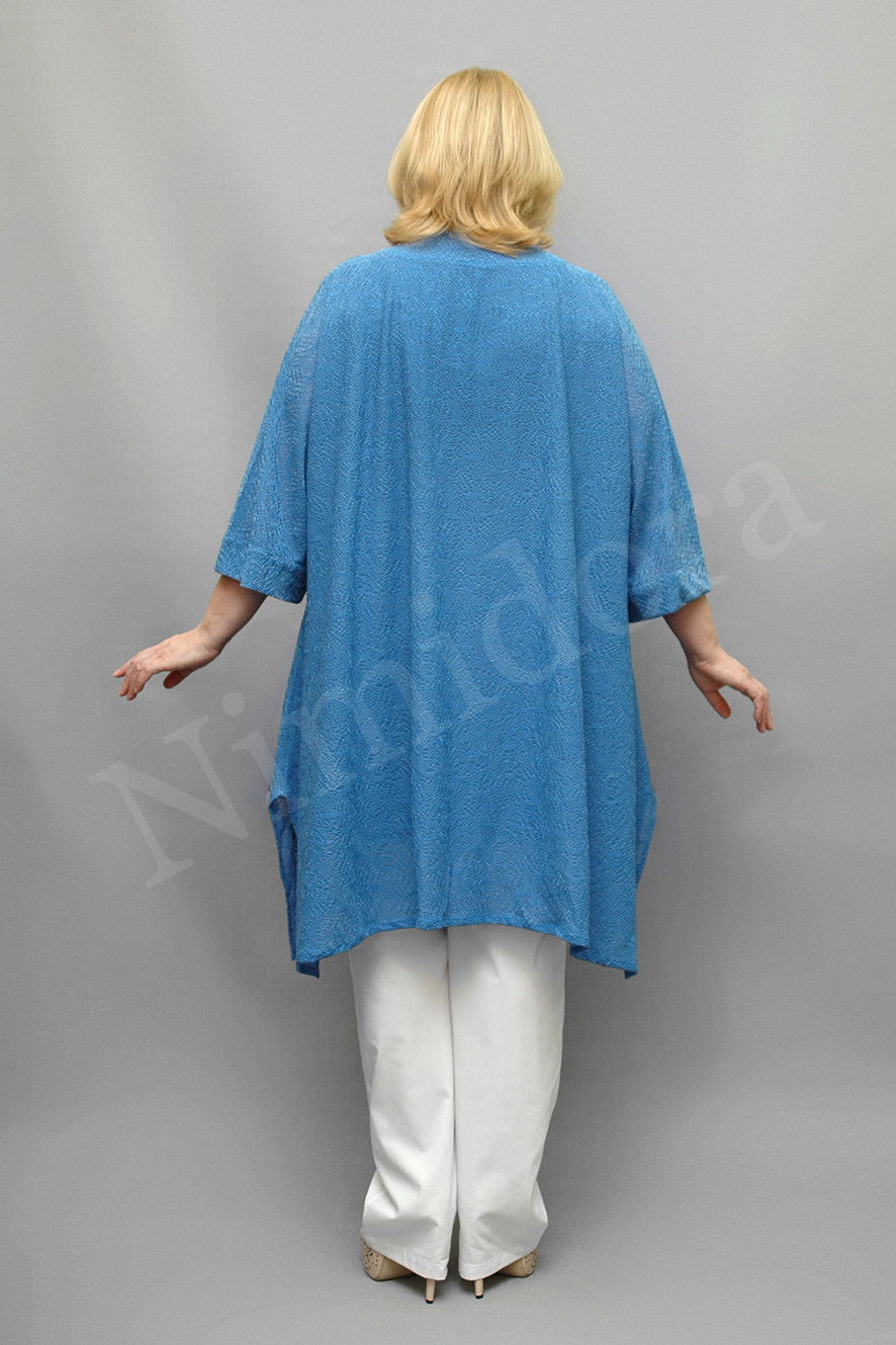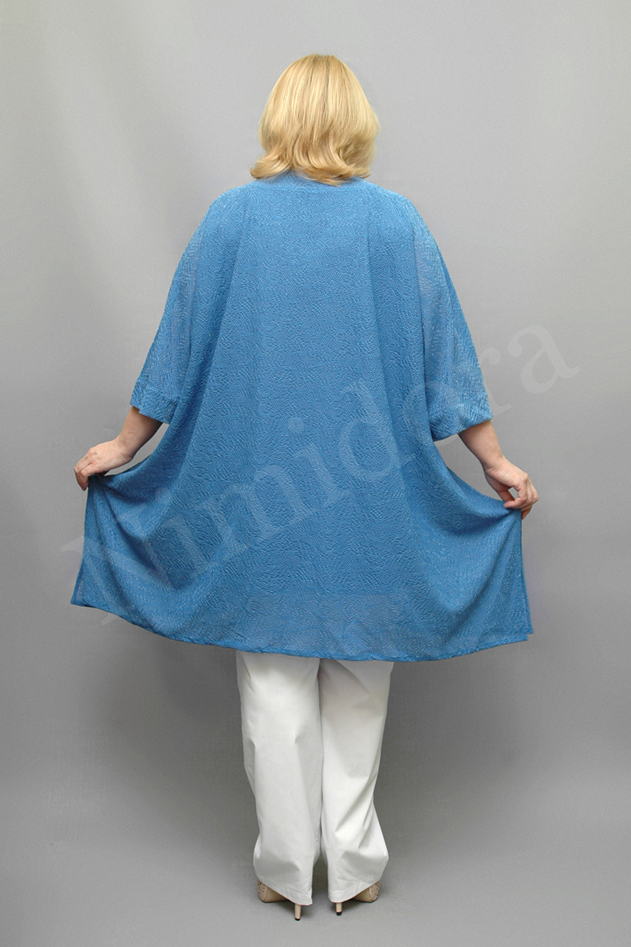 Жакет сильно расклешенного силуэта. Вырез и срезы полочек отделаны подкройной обтачкой. Застежка на одну пуговицу с воздушной петелькой. Полочки без вытачек и рельефов. Спинка без швов. Рукав цельнокройный, укороченный, подойдет на полные ручки. Манжеты высотой 5,5 см. Жакет сильно расклешен в боковых швах, благодаря чему создается неравномерная линия низа и эффект мягкой драпировки по бокам. Низ жакета подвернут на 1 см и подшит. Жакет без карманов, без подплечников, без подкладки.