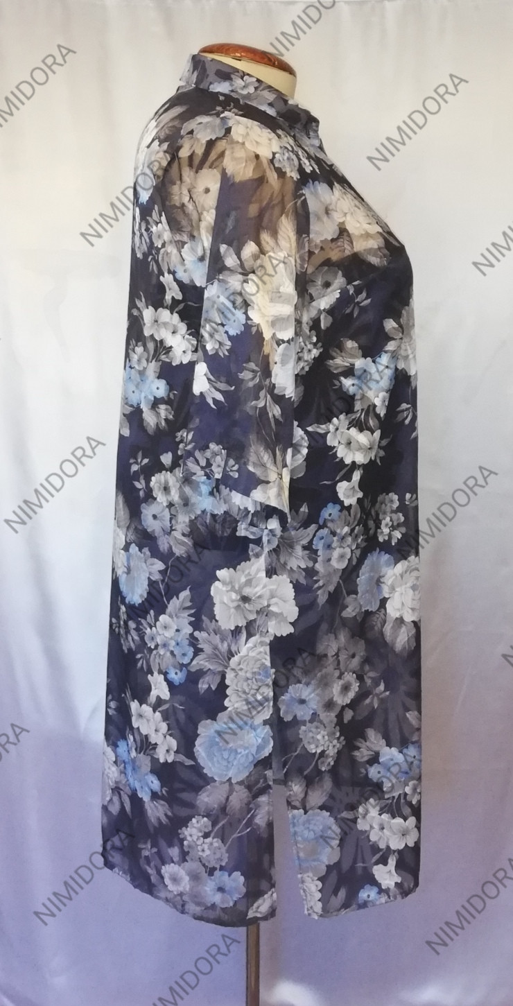 Красивая рубашка из неэластичного полотна. Ткань тонкая, мягкая, приятная на ощупь, немного просвечивает, не мнется. Рубашка немного расклешенного силуэта. Отложной воротник на стойке. Планка с застежкой на маленькие пуговицы. Полочка с боковой вытачкой. Спинка простая. Рукав втачной, длинный. Рубашка без карманов, с разрезами в боковых швах.