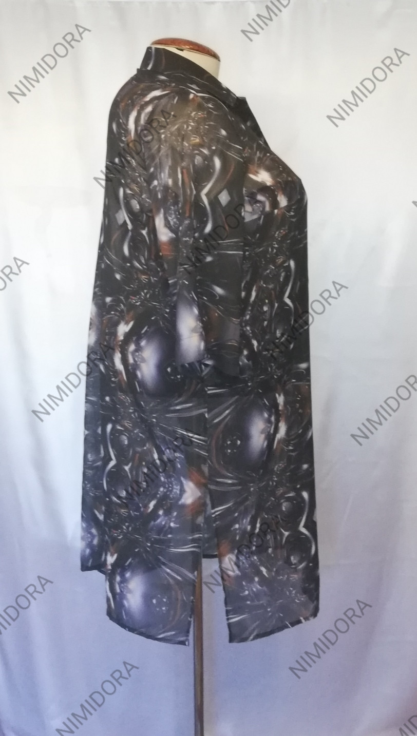 Красивая рубашка из неэластичного полотна. Ткань тонкая, мягкая, приятная на ощупь, немного просвечивает, не мнется. Рубашка немного расклешенного силуэта. Отложной воротник на стойке. Планка с застежкой на маленькие пуговицы. Полочка с боковой вытачкой. Спинка простая. Рукав втачной, длинный. Рубашка без карманов, с разрезами в боковых швах.